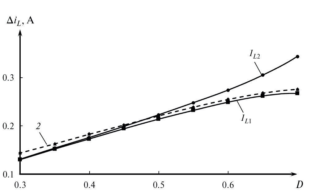 При изменении коэффициента заполнения D относительно минимума разница между расчетными значениями и значениями, полученными при моделировании, увеличивается. Так, для ΔiL1 разница составляет 14 мА (10%) и 9 мА (3%), для ΔiL2 — 13 мА (9%) и 68 мА (24%), для ΔuC1— 0.62 мВ (14%) и 10.55 мВ (23%), а для ΔuC2— 2.4 мВ (28%) и 17 мВ (23%), при коэффициентах заполнения D равных 0.3 и 0.7 соответственно.