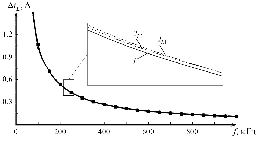 Рис. 5. Влияние частоты коммутации силового транзистора на размахи пульсаций токов, протекающих через обмотку дросселей L1 и L2 при коэффициенте заполнения, равном 0.5: 1 — расчетное значение ΔiL, 2L1 — результат моделирования ΔiL1м 2L2 — результат моделирования ΔiL2м