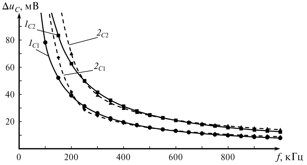 Рис. 6. Влияние частоты коммутации силового транзистора на размахи пульсаций напряжения на конденсаторах С1 и С2 при коэффициенте заполнения, равном 0.5: 1С1 — расчетное значение ΔuC1; 2С1 — результат моделирования ΔuC2; 1С2 — расчетное значение ΔuC2 2С2 — результат моделирования ΔuC2м.