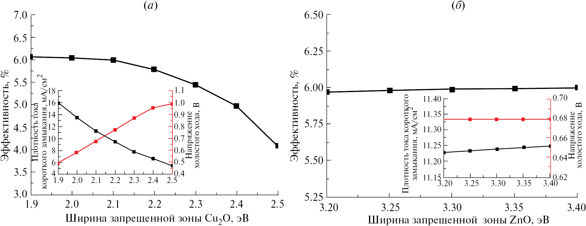 Из рис. 4, а видно, что с увеличением ширины запрещенной зоны Cu2O происходит уменьшение плотности тока короткого замыкания от 16.04 до 5.4 мА/см2 и увеличение напряжения холостого хода от 0.49 до 0.99 В. Уменьшение плотности тока короткого замыкания объясняется смещением границы поглощения пленки Cu2O в область с меньшими длинами волн (λG = hc/EG), что снижает плотность фототока (5) и, соответственно, плотность тока короткого замыкания [14, 26]. Увеличение напряжения холостого хода происходит вследствие смещения края (потолка) валентной зоны Cu2O вниз, что приводит к увеличению контактной разности потенциалов и уменьшению обратной плотности тока насыщения (8). Изменение ширины запрещенной зоны ZnO существенно не влияет на фотоэлектрические характеристики, поскольку пленка ZnO является широкозонным окном для поглощения фотонов пленкой Cu2O. Таким образом, оптимальными величинами ширины запрещенной зоны Cu2O и ZnO являются 1.9 и 3.4 эВ соответственно.