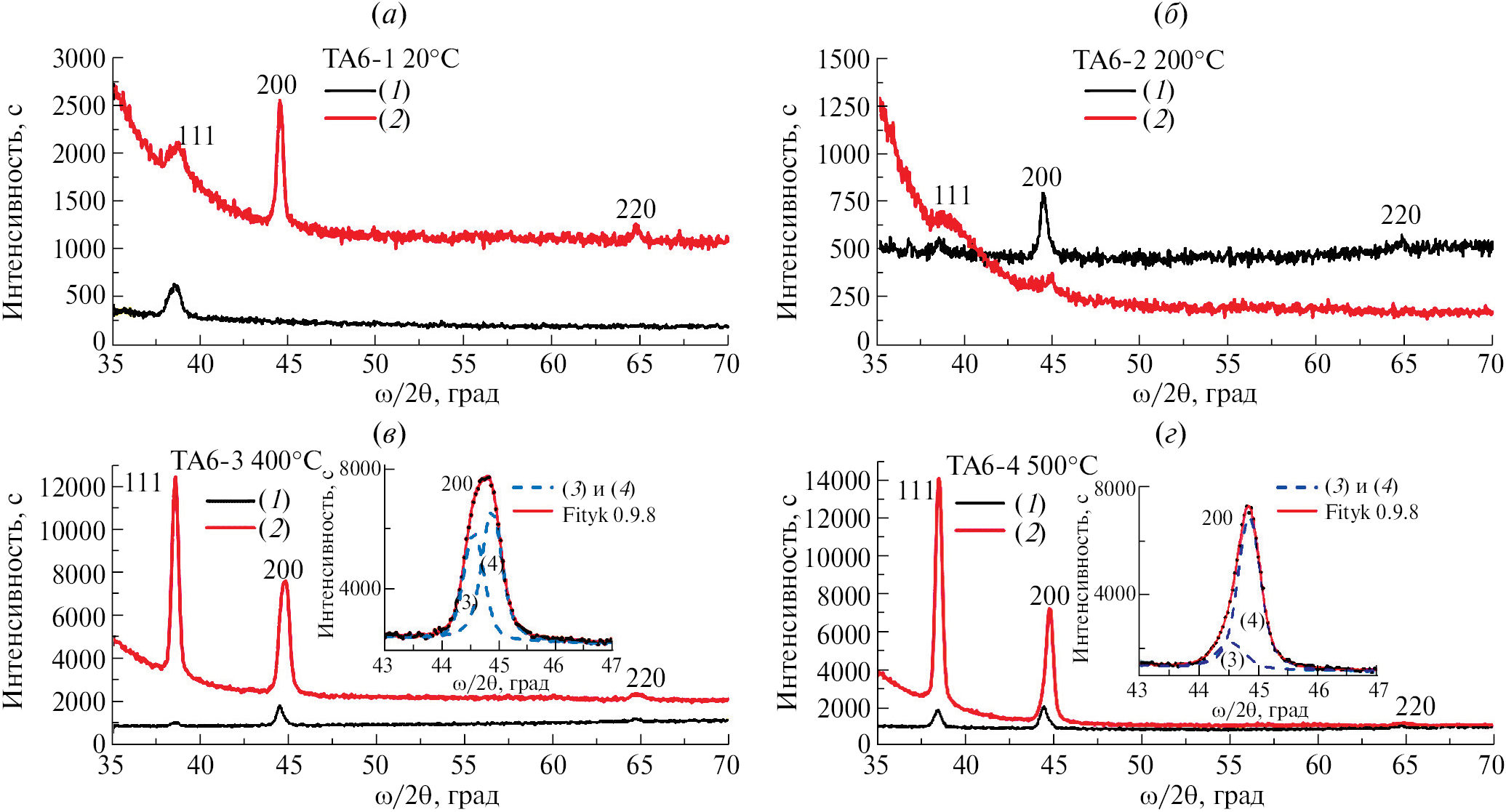 Рис. 3. Дифрактограммы от тонких островковых пленок Al/Si(111), распыленных при разных температурах подложки: 20°C (a), 200°C (б), 400°C (в) и 500°C (г). (1) — без точной настройки подложки Si(111), (2) — с точной настройкой подложки Si(111). На вставках показано моделирование пика 002 отражения двумя кривыми Фойгта при 2θ = 44.55° (3) и 44.85° (4). CuKα излучение