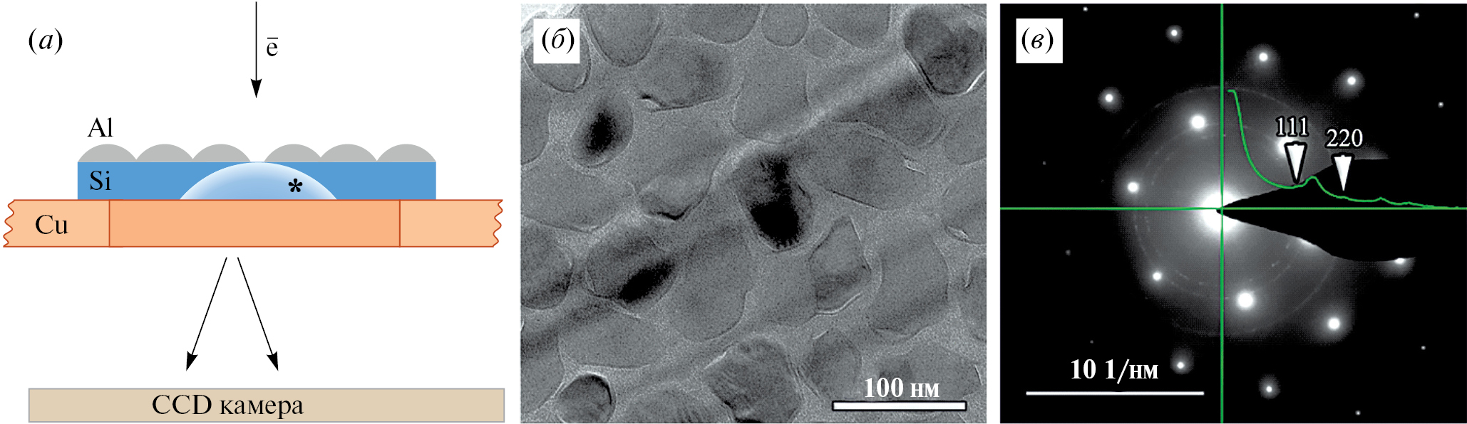 Рис. 4. Схема ПЭМ эксперимента (a), cветлопольное ПЭМ изображение “в плане” пленки Al (образец TA6–3) (б) и ее электронограмма (в)