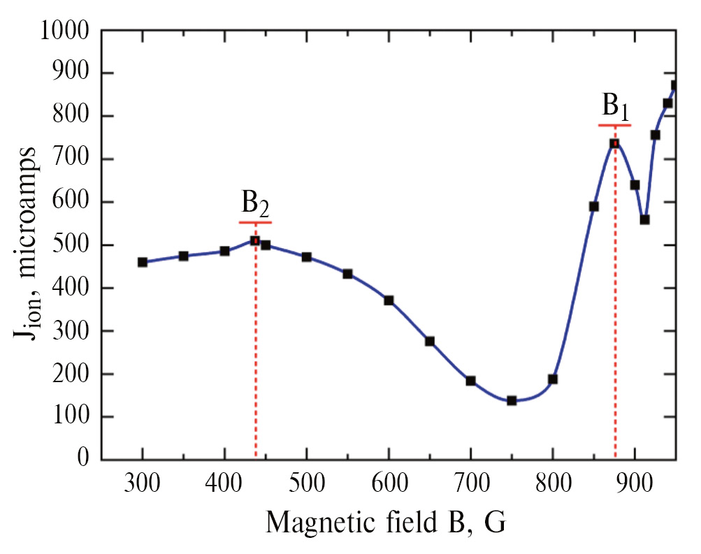 Зависимость тока насыщения Jion зонда Ленгмюра на оси камеры от напряженности магнитного поля показана на рис. 3 при давлении азота 1 мТорр и поглощаемой СВЧ мощности Pabs = 450 Вт. При напряженностях магнитного поля B1 = Br = 875 Гс и B2 = = Br /2 ≈ 438 Гс ток Jion проходит через максимумы. Величины этих максимумов зависят от давления газа и СВЧ мощности. Максимум при поле B1 соответствует ЭЦР, а максимум при поле B2 соответствует резонансу на второй циклотронной гармонике.
