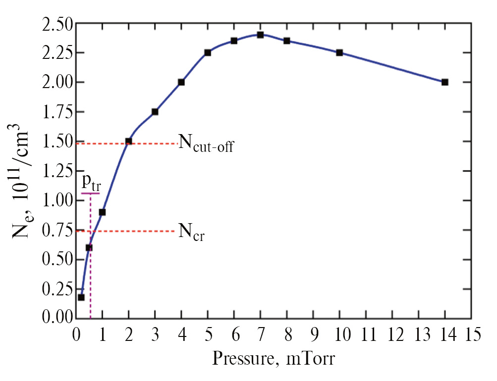 Переход от разреженной плазмы к сверхплотной возможен в том случае, когда поглощенной СВЧ мощности достаточно для возбуждения плазмы с плотностью более Ncr [21]. При давлениях менее 1 мТорр частота столкновений электронов с нейтральными частицами мала для обеспечения поглощения СВЧ мощности за счет столкновений. В этом случае для эффективного поглощения СВЧ мощности электронами используется электронный циклотронный резонанс право поляризованных СВЧ волн.