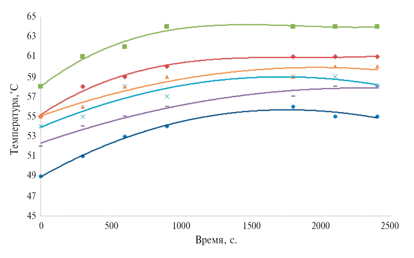 На рис. 3 показаны экспериментальные данные по изменению параметров теплоносителя. Отсчёт температуры начинался и при её росте, и после установления режима охлаждения, при котором изменения температур теплоносителей практически не было.