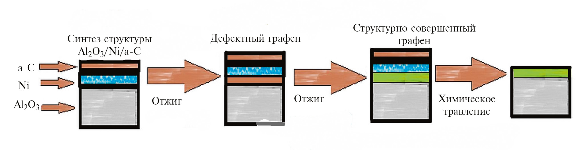 Впервые метод синтеза однослойного эпитаксиального графена путем отжига структур с твердыми источниками углерода на диэлектрических подложках, покрытых металлической пленкой, был применен в [30]. Этот подход открыл новый путь для производства графена и получил широкое распространение. В этом методе твердый источник углерода осаждается между слоями никеля и изолирующими подложками или над ними, и эта структура подвергается отжигу при температурах от 500 °C до 1000 °C. Углерод диффундирует в пленку никеля, и при охлаждении на верхней и нижней поверхности никеля образуется однослойный или двухслойный графен, приобретая кристаллическую структуру на матрице Ni. После стравливания никеля непосредственно на подложке получается графен.