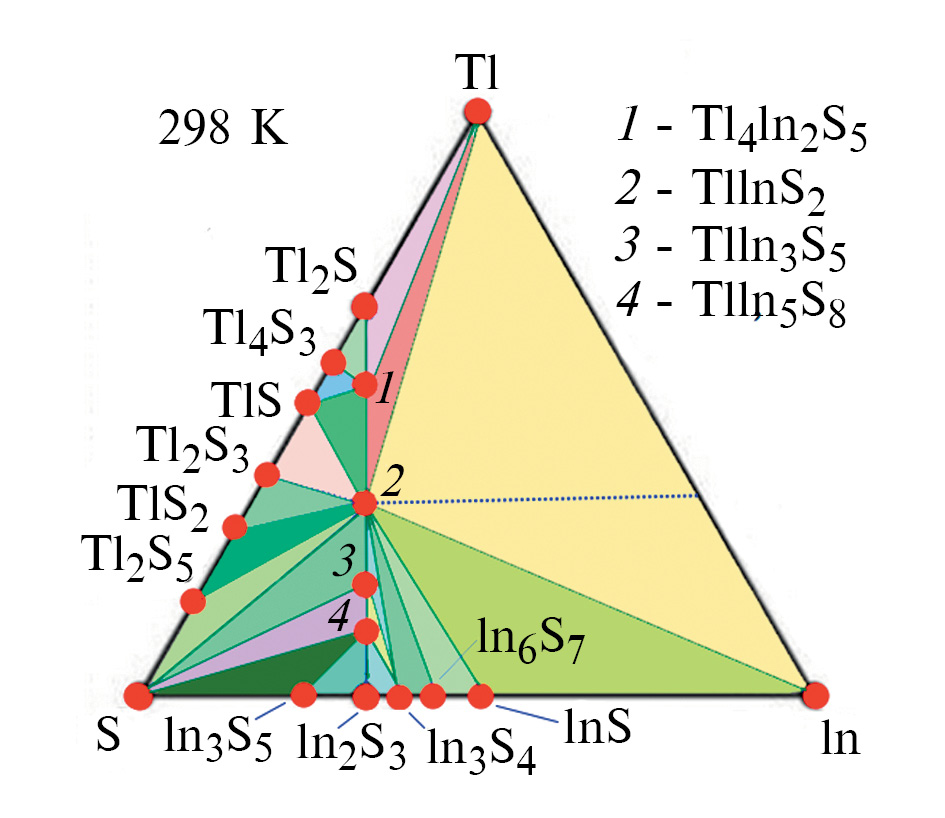 В системе Tl–In–S, в частности, соединение TlInS2 с моноклинной структурой занимает на диаграмме очень малую область гомогенности. Установлено, что рассчитанные значения энергии образования фазы TlInS2 в твердом состоянии соответствуют экспериментальным данным: = –181 кДж/моль (термодинамический расчет), = –181.35 ± 7.5 кДж/моль (эксперимент).
