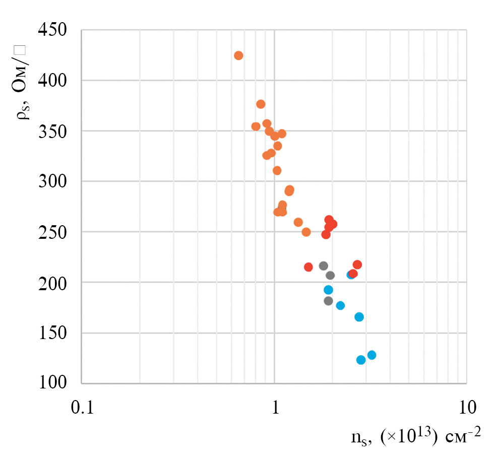Рис. 1. Зависимость ρs от ns для ГС с барьерными слоями различного состава: AlxGa1-xN (0,18 ≤ x ≤ 0,36) – коричневые маркеры; InхAl1-хN (х = 0,17–0,18) – красные маркеры; InAlGaN с различной мольной долей In – серые маркеры; AlN – голубые маркеры [2, 3, 6, 9–11, 13–39].