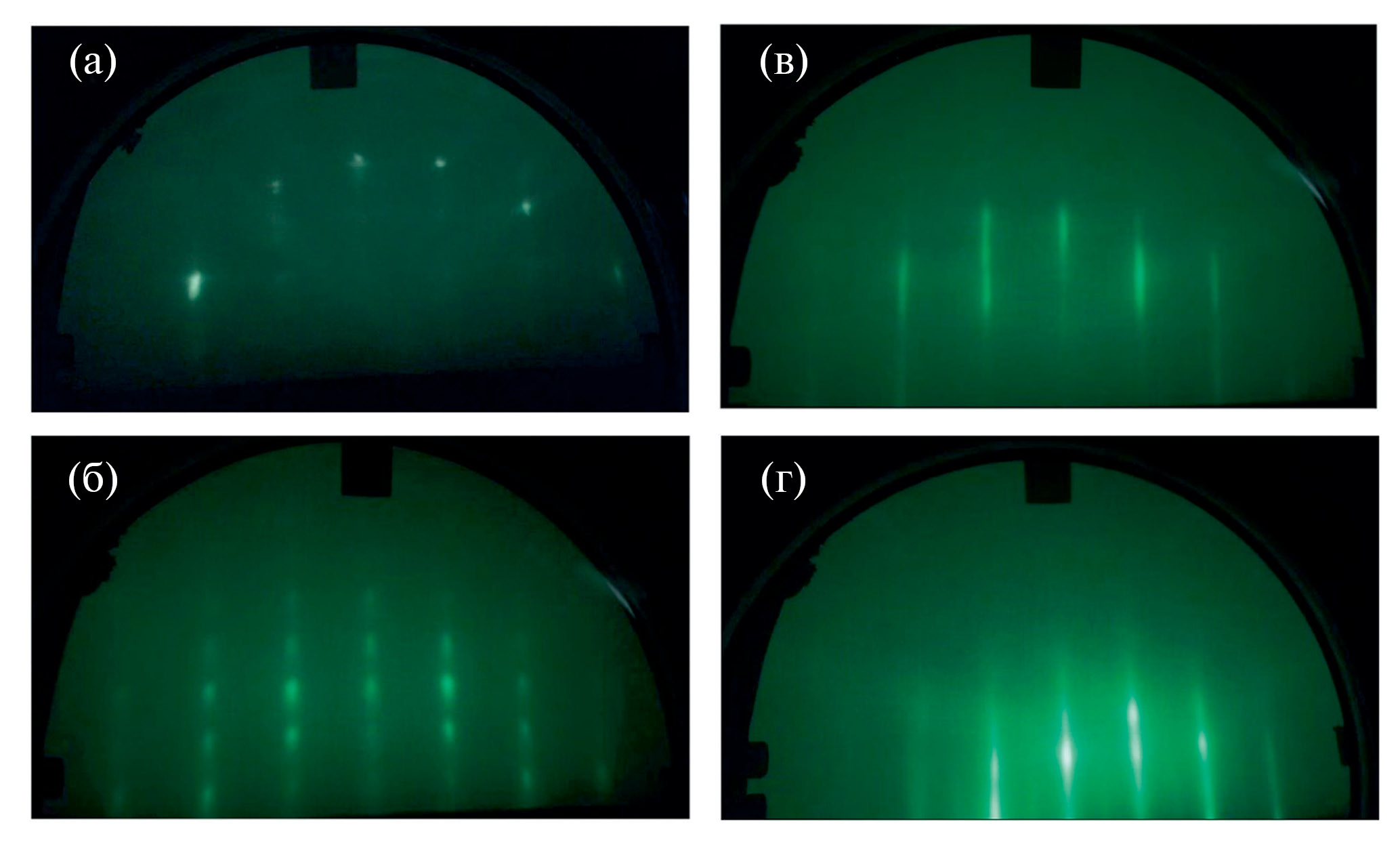 Рис. 2. Типичные картины ДОБЭ от исходной подложки (а) и экспериментальных ГС в направлении на стадии нуклеации (б); в процессе формирования GaN буфера (в); в случае остановки процесса роста GaN и снижения параметра Ts до 600°С (г).