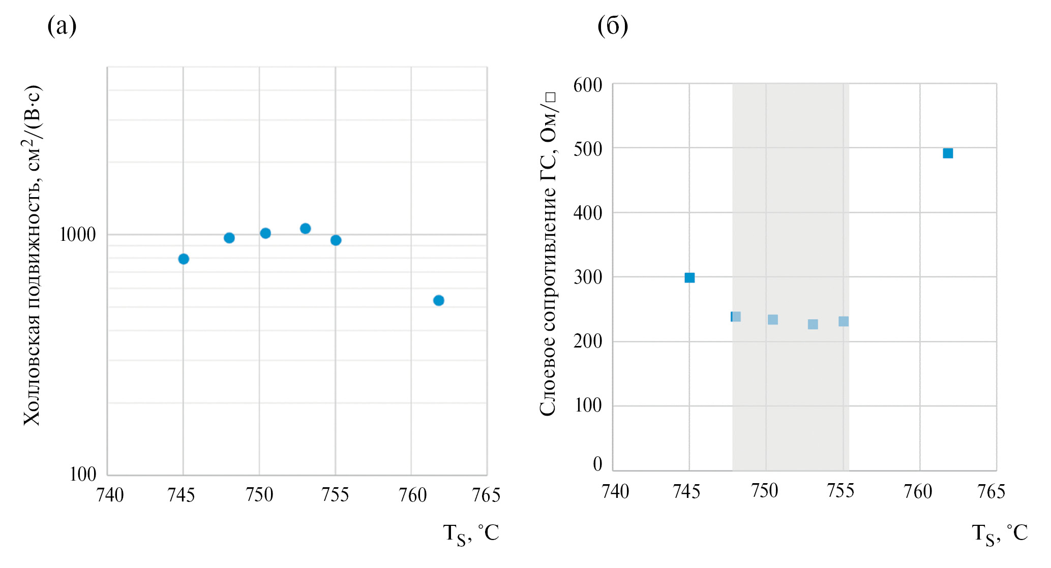 На рис. 3 а, б показаны зависимости подвижности 2DEG и слоевого сопротивления полной ГС (ρs), соответственно, от параметра <Ts>. Из представленных экспериментальных зависимостей следует, что ГС с наилучшими транспортными свойствами (ρ = 230–240 Ом/□) могут быть получены в диапазоне <Ts> ≈ 748–755°C. Причем со стороны высоких температур этот диапазон ограничен увеличением шероховатости ГС, что хорошо согласуется со сведениями о термической стабильности нитрида галлия [43] и с данными о вкладе шероховатости гетерограницы в рассеяние квазидвумерных носителей заряда [44].