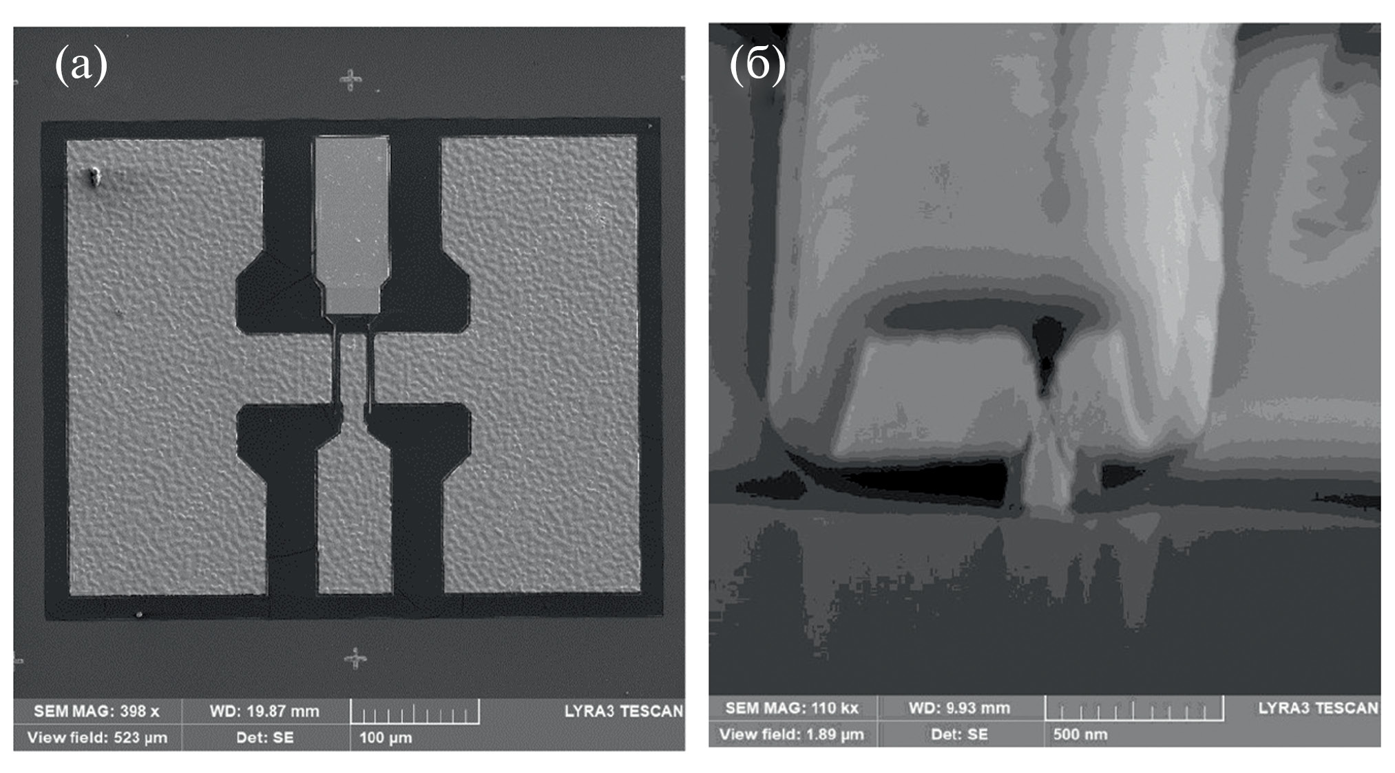 Рис. 5. (а) РЭМ изображение топологии тестового транзистора; (б) РЭМ изображение поперечного среза (ФИП) его затворной части (Т-образный затвор)