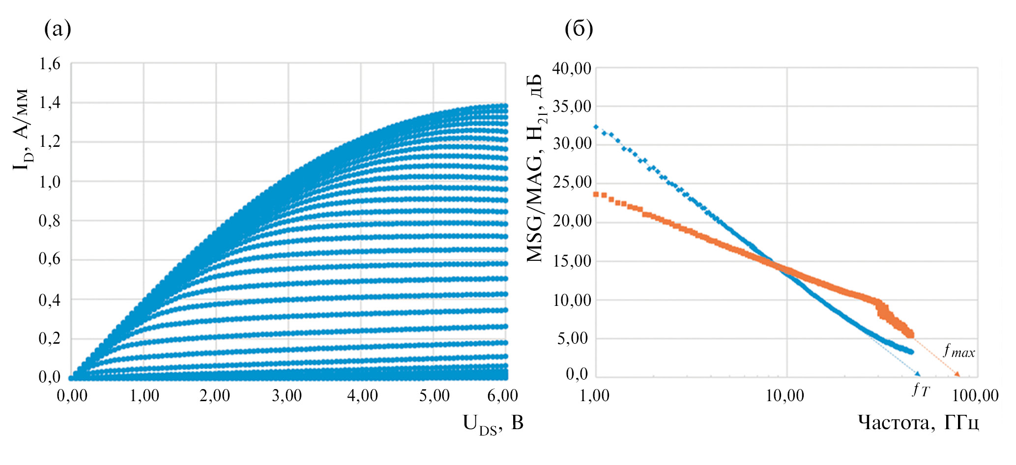 Рис. 6. Семейство выходных (DC) характеристик одного из тестовых транзисторов (при изменении напряжения на затворе UGS от – 7,0 до + 2,5 В) (а); типичные частотные зависимости модуля коэффициента передачи по току (|h21|) и максимально достижимого/стабильного коэффициента усиления по мощности (MAG/MSG) тестового транзистора (б).