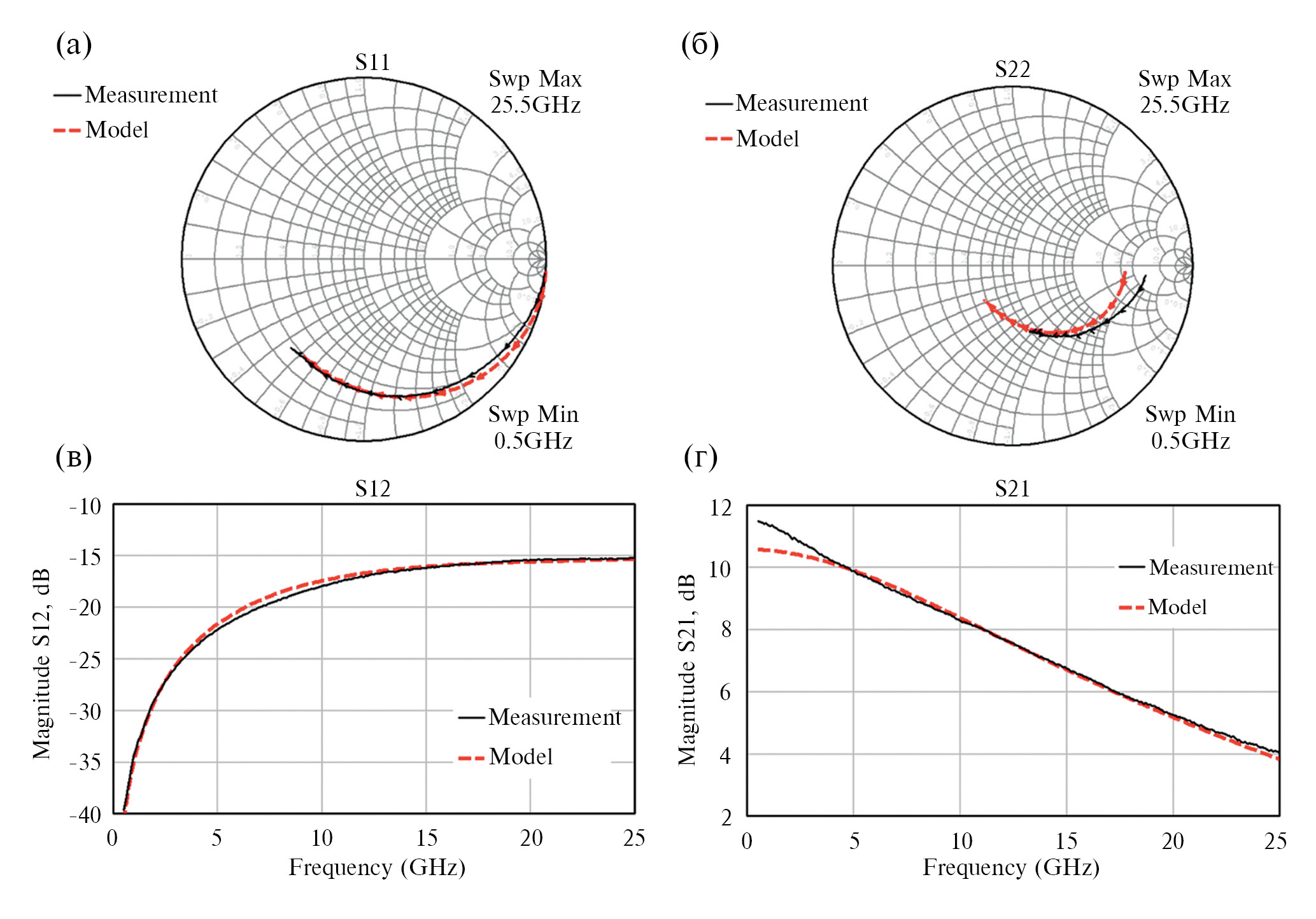 На рис. 8 представлены экспериментальные и рассчитанные значения S-параметров транзистора, измеренные в точке с наибольшей крутизной: при напряжении на затворе UGS = –2,75 В и напряжении сток-исток UDS = 5 В.