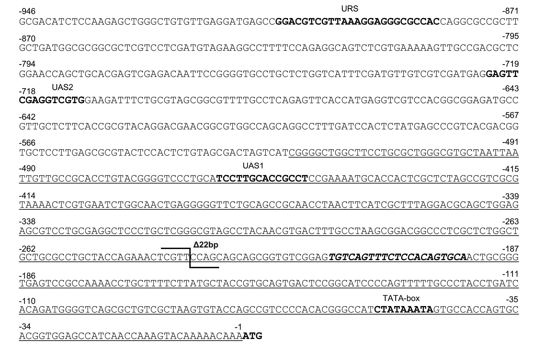 Промоторы эукариот, как правило, имеют больший размер, чем промоторы прокариот, и содержат коровый элемент (core) и специфические регуляторные последовательности — UAS (upstream activation sequences) и URS (upstream repressing sequence). Коровый элемент TATA-бокс — это сайт связывания TATA-связывающего белка (TBP), субъединицы транскрипционного фактора TFIID, включенного в процесс инициации транскрипции [9]. Последовательности UAS и URS — cis-действующие элементы — представляют собой сайты связывания с транскрипционными факторами, которые усиливают (активатор) или ослабляют (репрессор) силу промотора [10, 11]. Экспериментально было показано, что в 5′-регуляторном регионе промотора гена MOX из дрожжей O. polymorpha имеются последовательности, которые могут быть идентифицированы как UAS1, UAS2 и URS1 [2].