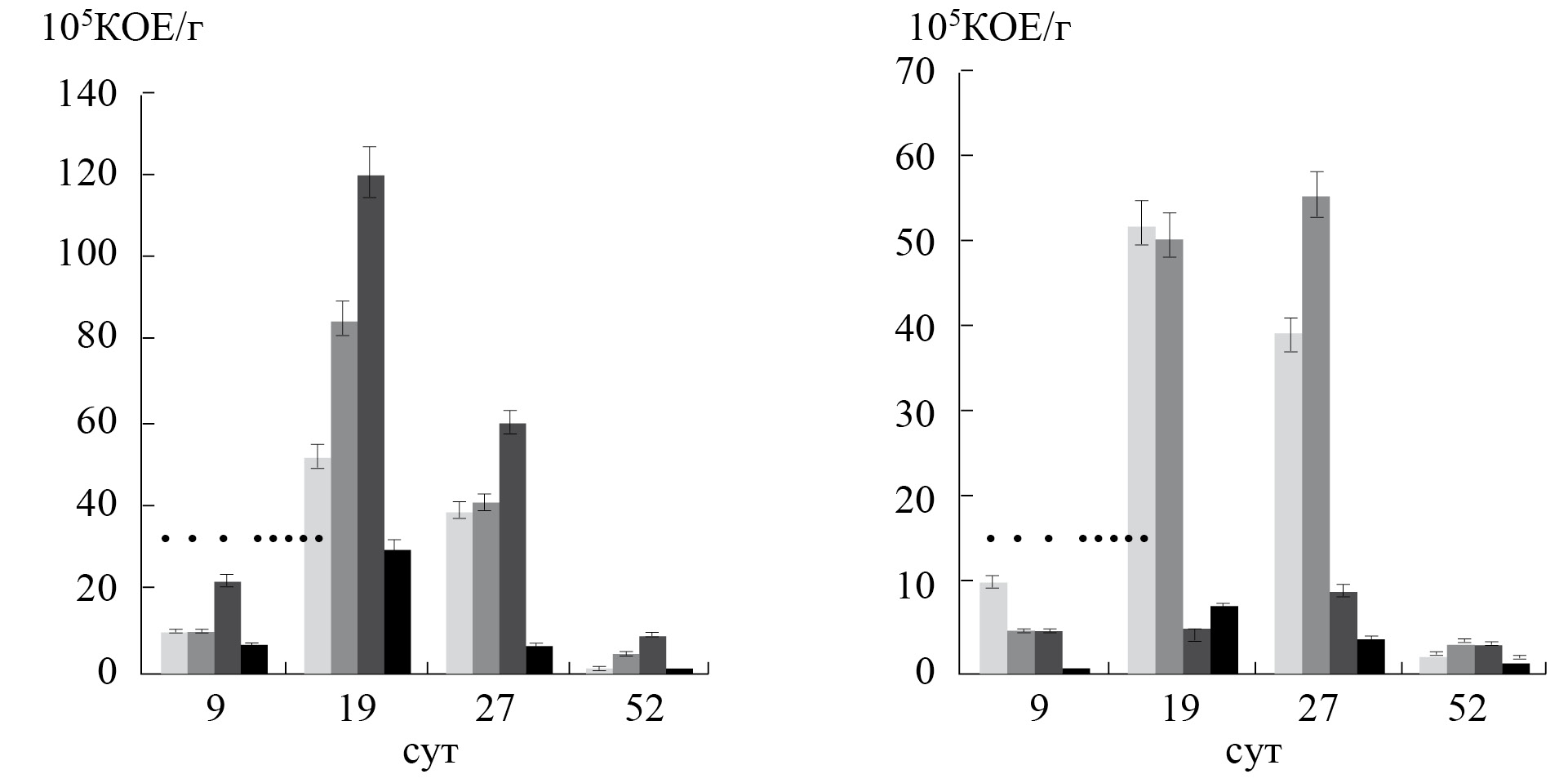 Анализ плотности популяции клеток штамма 22S в модельной системе “почва–интродуцент” показал, что численность штамма поддерживалась на достаточно высоком уровне — порядка 105 кл./г почвы на протяжении всего опыта (52 сут). При этом в начале опыта, по-видимому, происходила адаптация культуры к новым условиям, а после 9 сут титр штамма увеличился почти в 5 раз, а затем начал снижаться и к 27 сут стабилизировался на уровне 1.5–1.8 × 105 кл./г почвы и сохранялся таким до конца эксперимента.