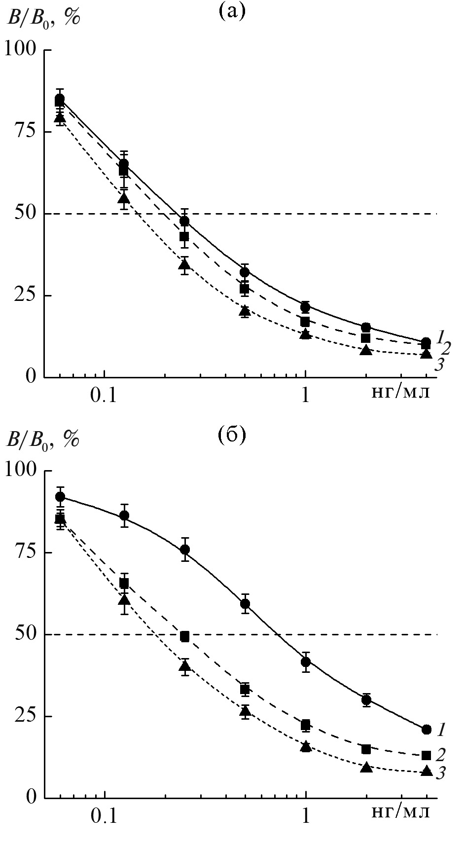Аналитическую чувствительность ИФА определяли как концентрацию ампициллина в нг/мл, при которой связывание конъюгата Амп-ПХ с ПАт отличается от B0 на двухкратную величину стандартного отклонения B0 (B0–2 SD) [34] при количестве измерений, равном 10. Аналитическую чувствительность рассчитывали по уравнению прямой y = ax + b, проведенной по точкам градуировочного графика, соответсвующим концентрациям ампициллина 0, 0.06 и 0.13 нг/мл.