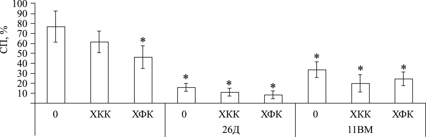 Рис. 1. Влияние конъюгатов ХКК и ХФК в композициях с B. subtilis 26Д и B. subtilis 11ВM на пораженность листьев карто-феля P. infestans на 10 сутки после инокуляции. Звездочкой отмечены значения, значимо отличающиеся от контрольных значений по критерию Краскела–Уоллиса.
