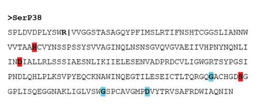 Рис. 1. Последовательность rProSerP38. R| – место процессинга трипсином (отщепление пропептида). Красным отмечены аминокислотные остатки активного центра (HDS), голубым – субстрат-связывающего субсайта S1 (GGD).