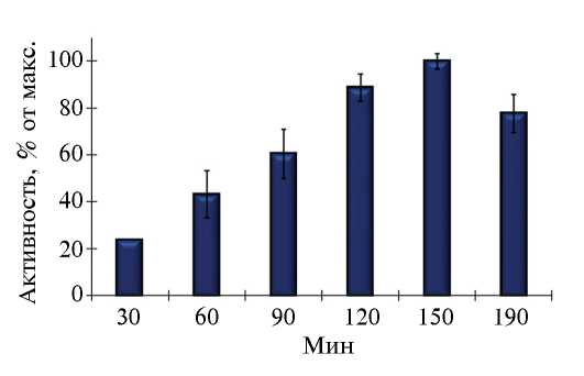 Рис. 2. Зависимость активности процессированного препарата рекомбинантной пропептидазы rProSerP38 T. molitor от времени процессинга. Планки погрешностей отражают доверительный интервал.