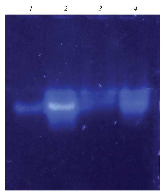 Рис. 6. Результат постэлектрофоретического тестирования активности по флуорогенному субстрату Suc-AAPF-AMC: 1 – препарат rProSerP38 до процессинга; 2 – препарат пептидазы rProSerP38, процессированной трипсином; 3 – объединенные фракции элюата 16–18 до обессоливания; 4 – объединенные фракции 16–18 после обессоливания и концентрирования.