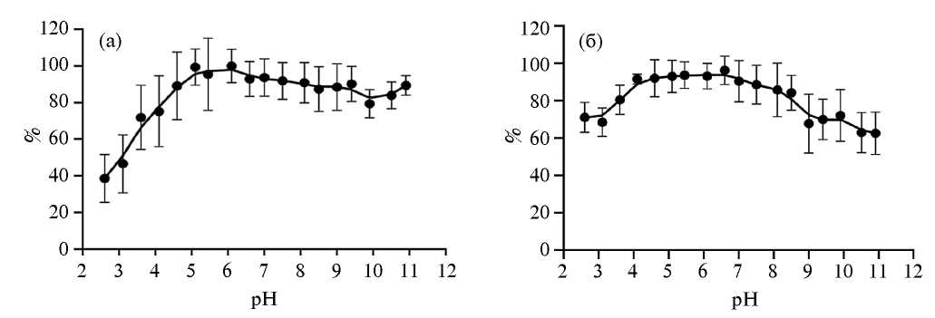 Рис. 10. Влияние рН на стабильность рекомбинантной пептидазы rSerP38 T. molitor (7 нМ): а) без БСА, инкубация 30 мин; б) в присутствии БСА (0.62 мкМ).