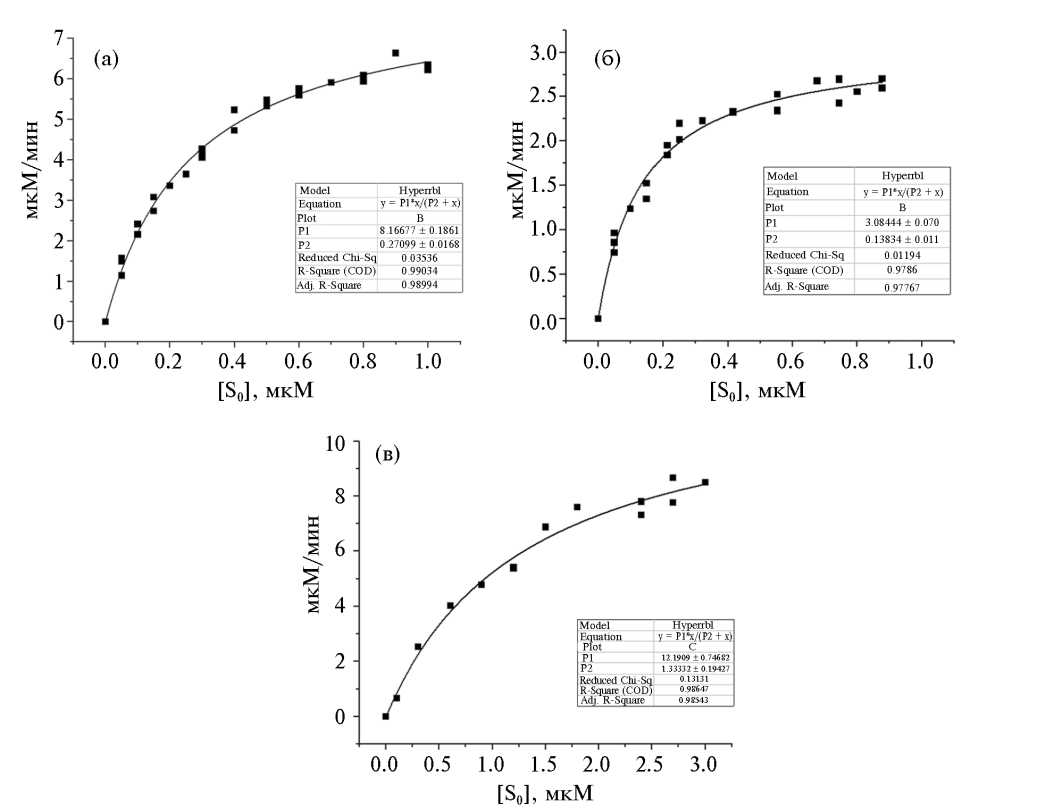Полученные зависимости обрабатывали при помощи нелинейной регрессии и определяли кинетические параметры гидролиза – константу Михаэлиса Kм, каталитическую константу kcat (табл. 1).