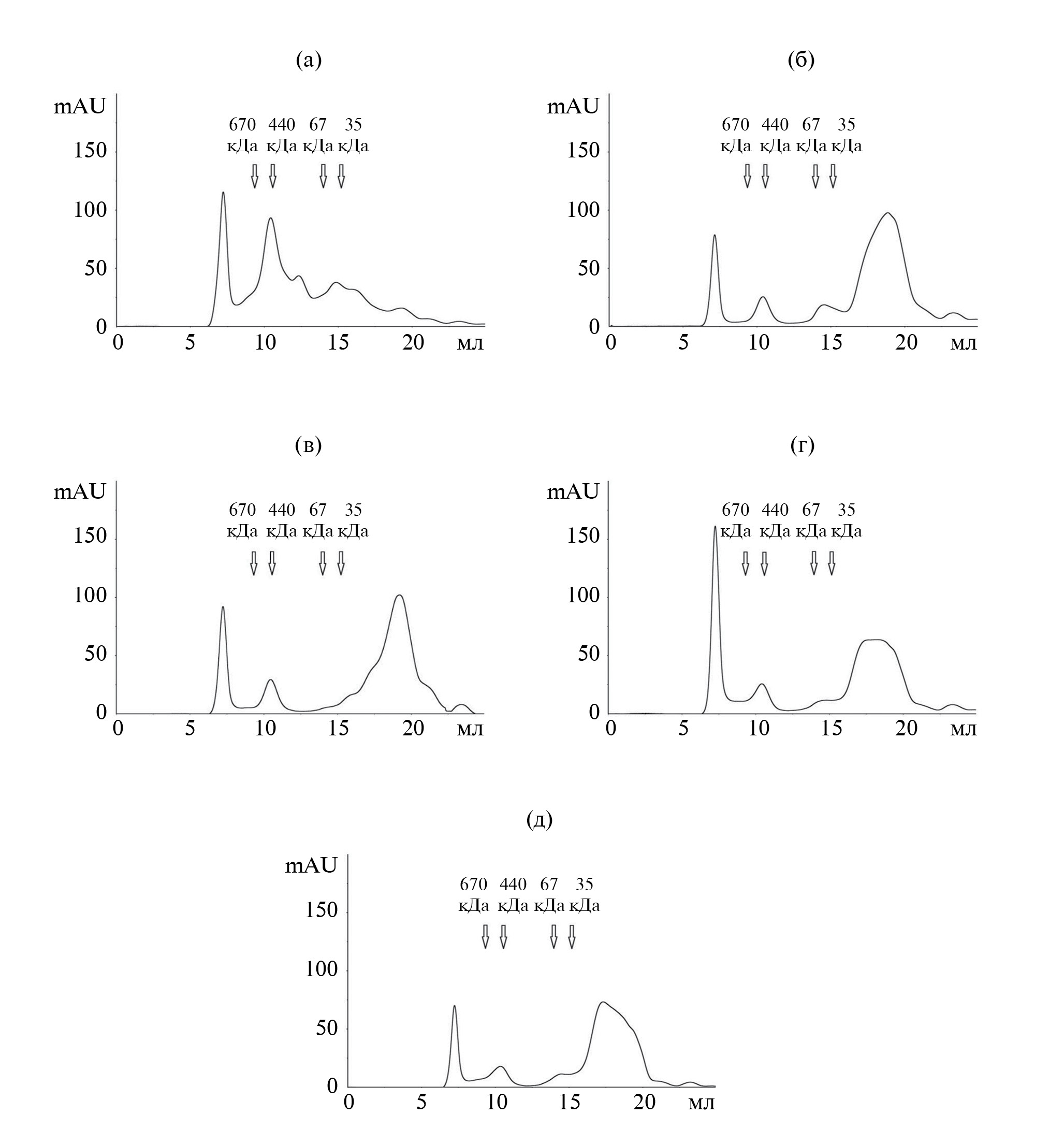 Рис. 1. Хроматография необработанного изолята горохового белка (а), а также изолятов, обработанных препаратами БНП (б), ГКП (в), БЩП (г) и ГЩП (д), на колонке Superdex 2000 10/300 Gl.