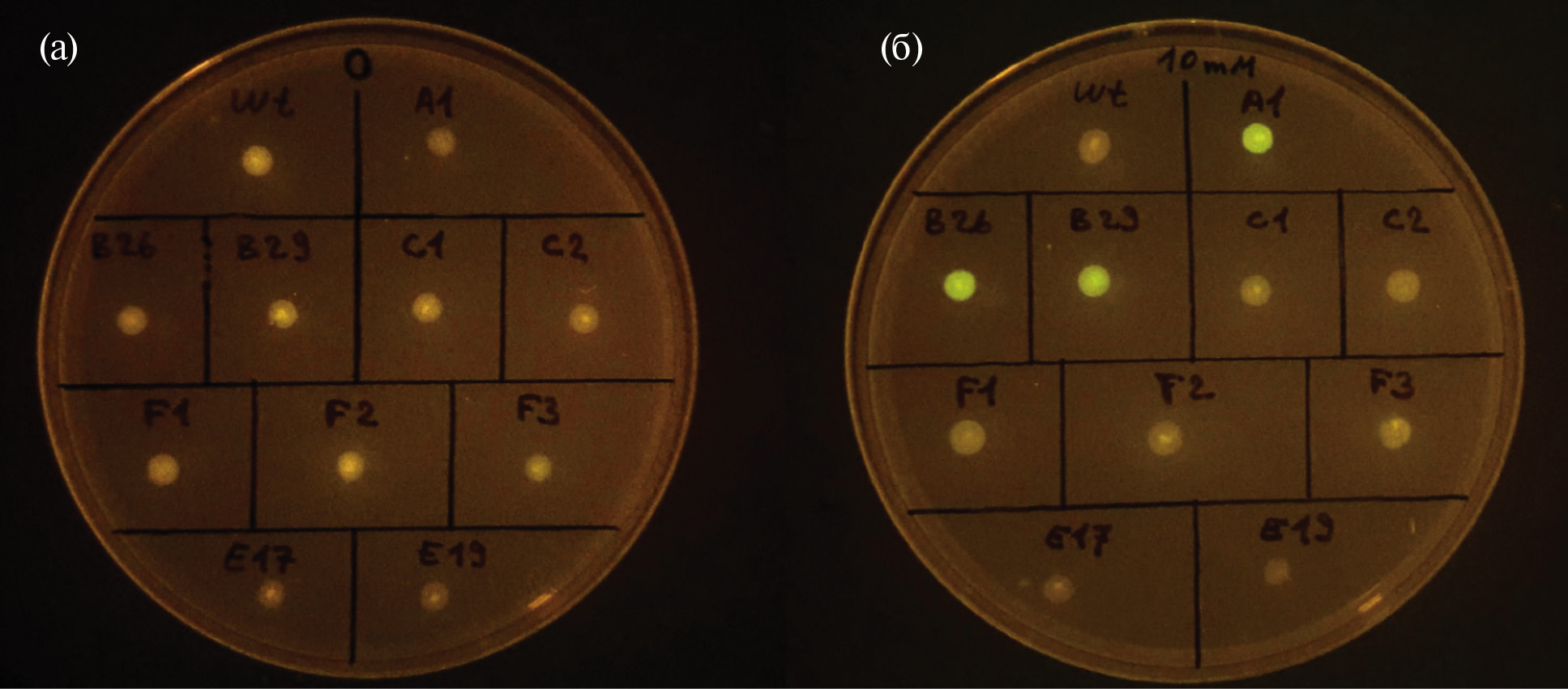 Качественная оценка флуоресценции сконструированных штаммов. На первом этапе активность сконструированных биосенсоров (табл. 1) оценивали качественно: по интенсивности зеленой флуоресценции биомассы штаммов, выращенных на агаризованной среде, содержащей 0 (контроль) и 10 мМ формиата натрия (рис. 1). Видно, что большая часть тестируемых штаммов не флуоресцирует, как и дикий штамм Y-3178 (wt), даже в присутствии формиата (рис. 1 б). Выраженное зеленое свечение демонстрируют 3 варианта штамма – А1, В26 и В29.