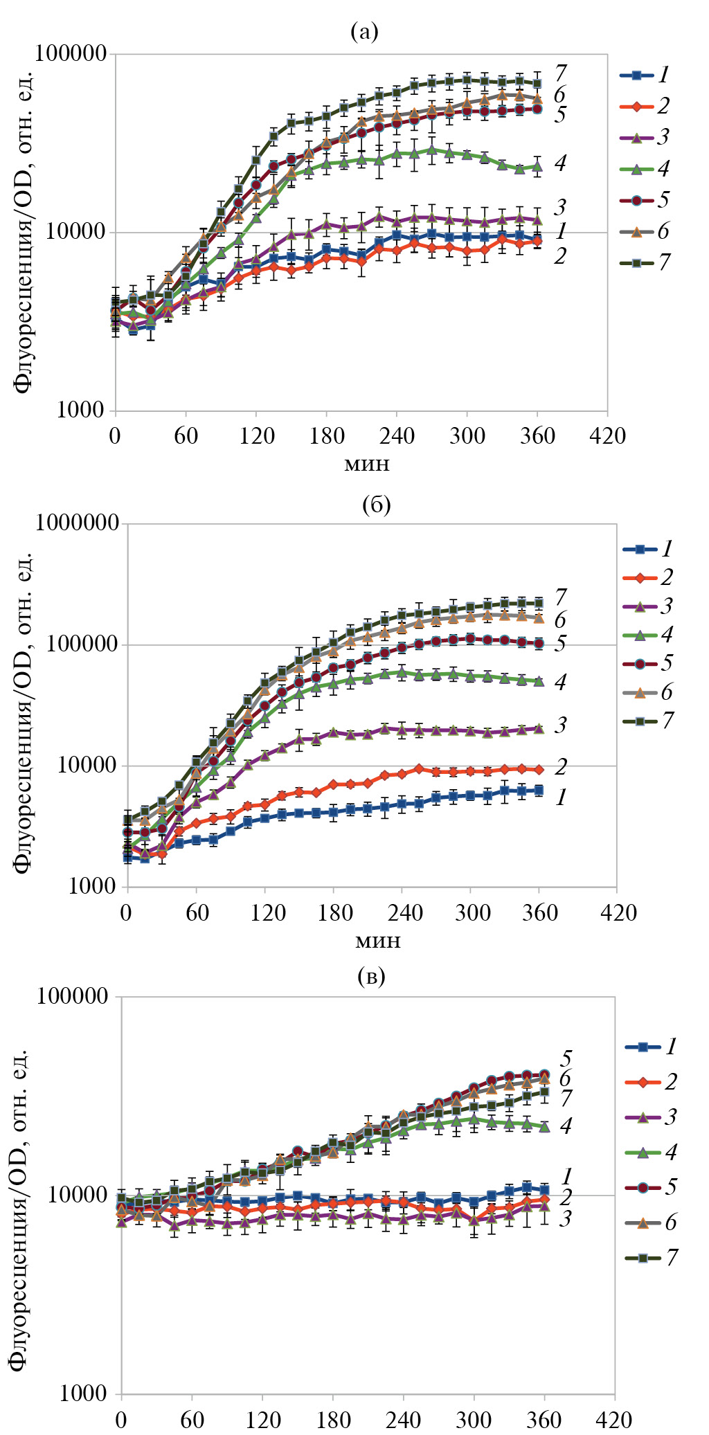 Для измерения временной зависимости интенсивности флуоресценции биосенсоров от различных концентраций индуктора дрожжевые штаммы рассевали на агаризованной YNB с 1 об./об. % глюкозы и выращивали при 30°С в течение 20 ч. Выросшую биомассу клеток разводили в жидкой YNB, содержащей необходимые концентрации источника углерода и индуктора, до оптической плотности 0.3. Контрольные пробы готовили аналогично, но без добавления индуктора. По 100 мкл приготовленных проб переносили в лунки планшета 655096 “Greiner Bio-One” (Германия), который затем помещали в мультимодальный ридер CLARIOstar Plus (“BMG Labtech”, Германия) и инкубировали при 30°С и 500 об./мин в течение 6 ч с измерением оптической плотности и флуоресценции каждые 15 мин согласно [22]. Относительную флуоресценцию для каждой лунки рассчитывали путем деления измеренных значений флуоресценции на значения оптической плотности (FLU/OD600). Количество повторов составляло 5 лунок для каждой концентрации формиата натрия. Обработку данных проводили с использованием программного обеспечения MARS (“BMG Labtech”, Германия) и Excel (“Microsoft”, США).