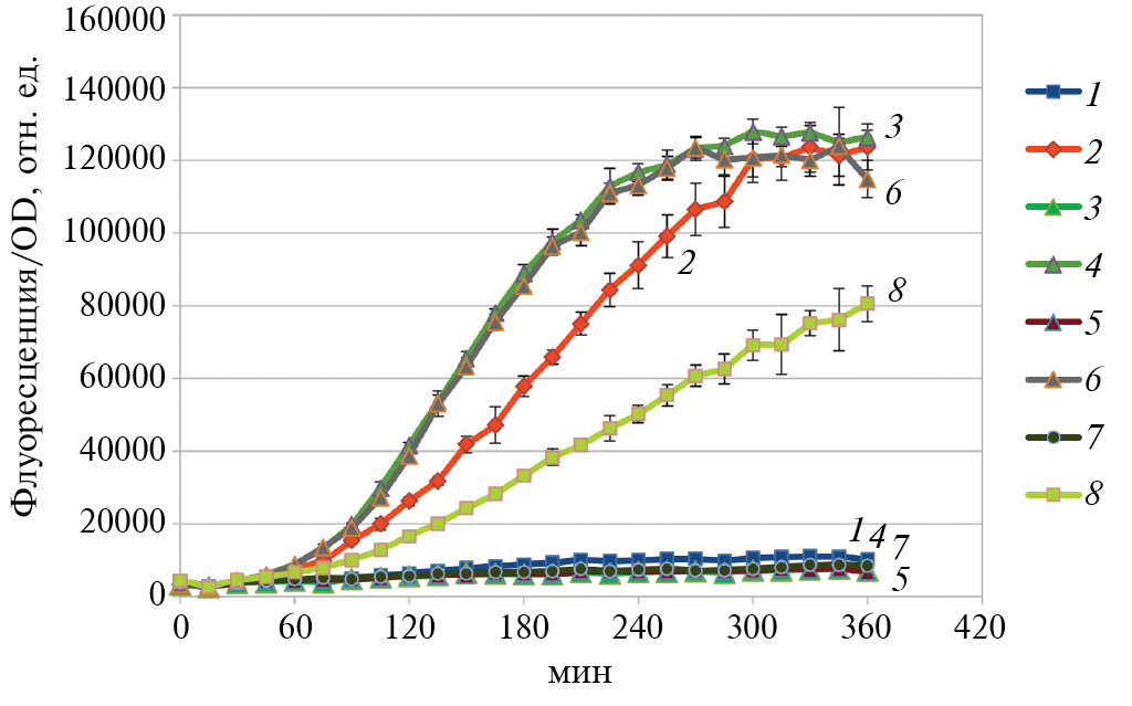 Рис. 4. Влияние источников углерода в питательной среде на активацию биосенсора В26 при добавлении 10 мМ формиата: 1 ‒ глюкоза (1%), 2 ‒ глюкоза и формиат, 3 ‒ сорбит (1.5%), 4 ‒ сорбит и формиат, 5 ‒ маннит (1%), 6 ‒ маннит и формиат, 7 ‒ цитрат (1%), 8 ‒ цитрат и формиат.