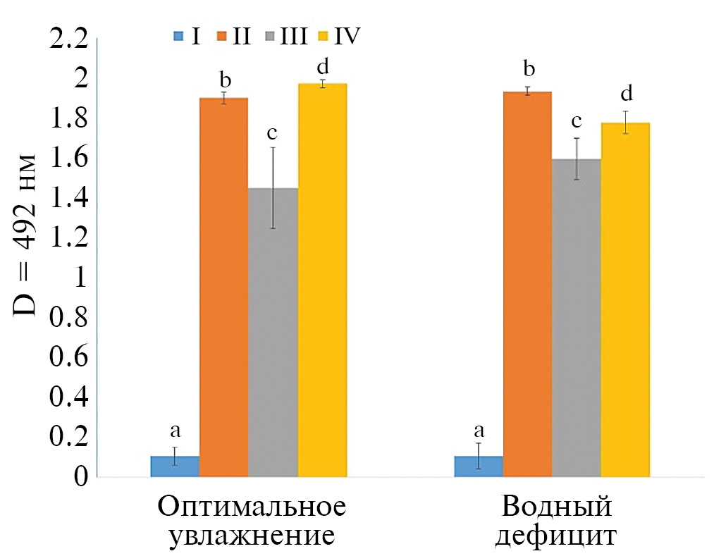 Результаты ИФА продемонстрировали, что обработка растений конъюгатом Хит-КК снижала степень инфицирования листьев картофеля на 24 ± 2,0% и 17 ± 0,9% в условиях оптимального и недостаточного увлажнения почвы соответственно. Совместная обработка Хит-КК и B. subtilis 47 не влияла на степень инфицирования растений YВК при оптимальном увлажнении, но в условиях дефицита влаги применение Хит-КК совместно с B. subtilis 47 снижало уровень заражения на 9.1% (рис. 2).