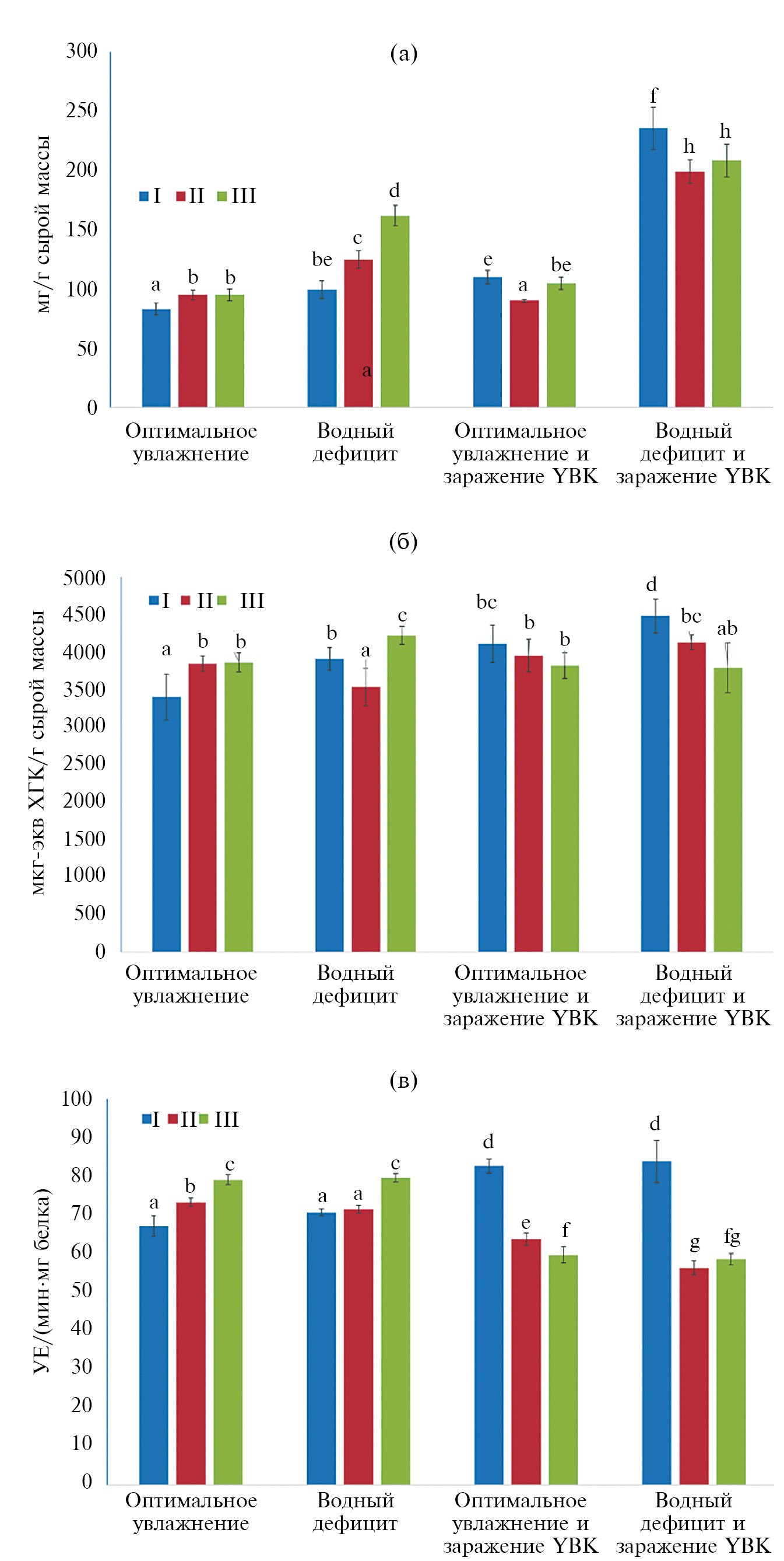Рис. 3. Влияние обработок (I‒III) на содержание пролина (а), содержание фенольных соединений (б) и активность ПФО (в) в листьях здоровых и зараженных YВК растений картофеля в оптимальных условиях увлажнения и при водном дефиците в почве: I – контроль; II – обработка Хит-КК; III – обработка Хит-КК + B. subtilis 47.