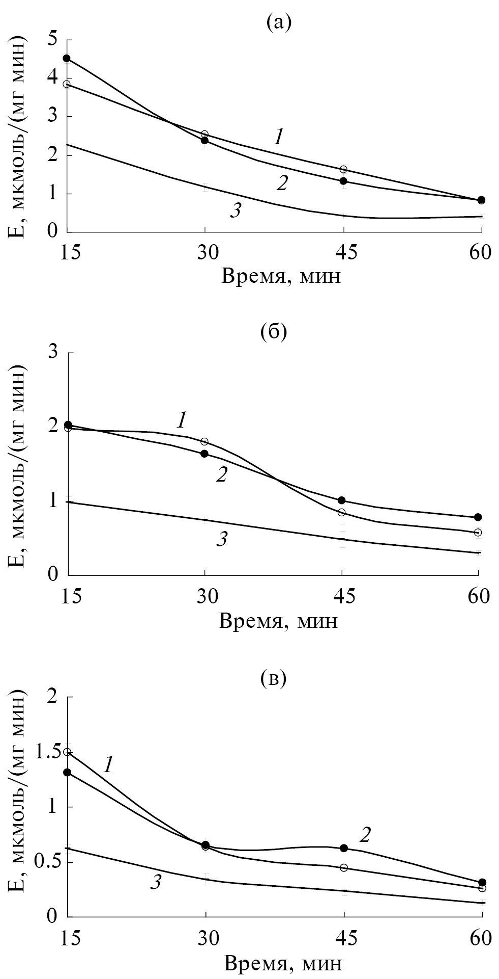 Рис. 3. Термоинактивация фитазы при 50 (а), 60 (б) и 70°С (в): 1 — фитаза, иммобилизованная включением в гель альгината бария; 2 — фитаза, иммобилизованная на активированном хитозане; 3 — свободная фитаза.