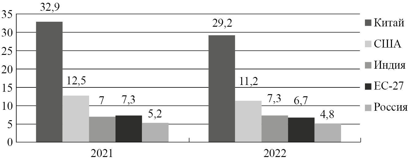 Рисунок 1. Страны-лидеры по выбросам CO2, 2021–2022 гг., %