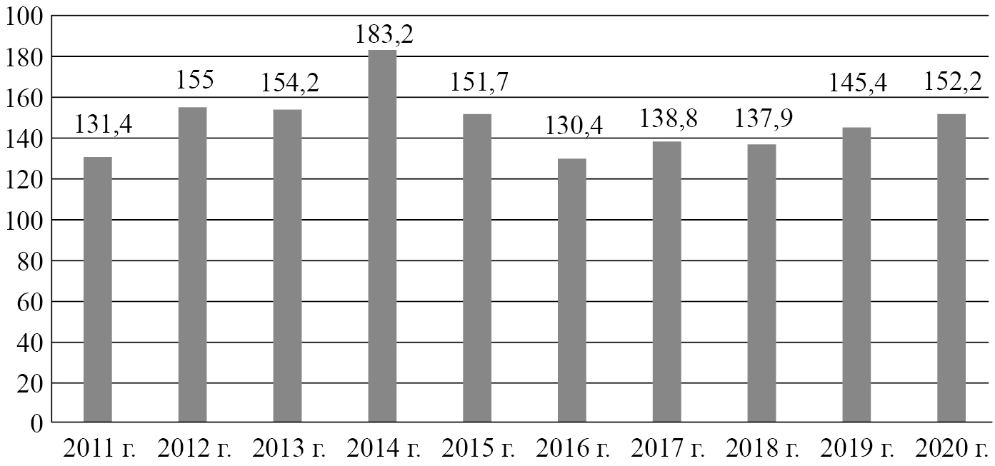 Вместе с тем совершенствование нормативной базы не повлияло на рост внимания бизнеса к этой области. Согласно исследованию компании ИНФРАГРИН, инвестиции в зеленую экономику неустойчивы и не показывают существенного роста (в 2020 г. они составили 152 млрд руб. (рис. 2), что соответствует 1% общего объема инвестиций в основной капитал и 0,2% от ВВП).
