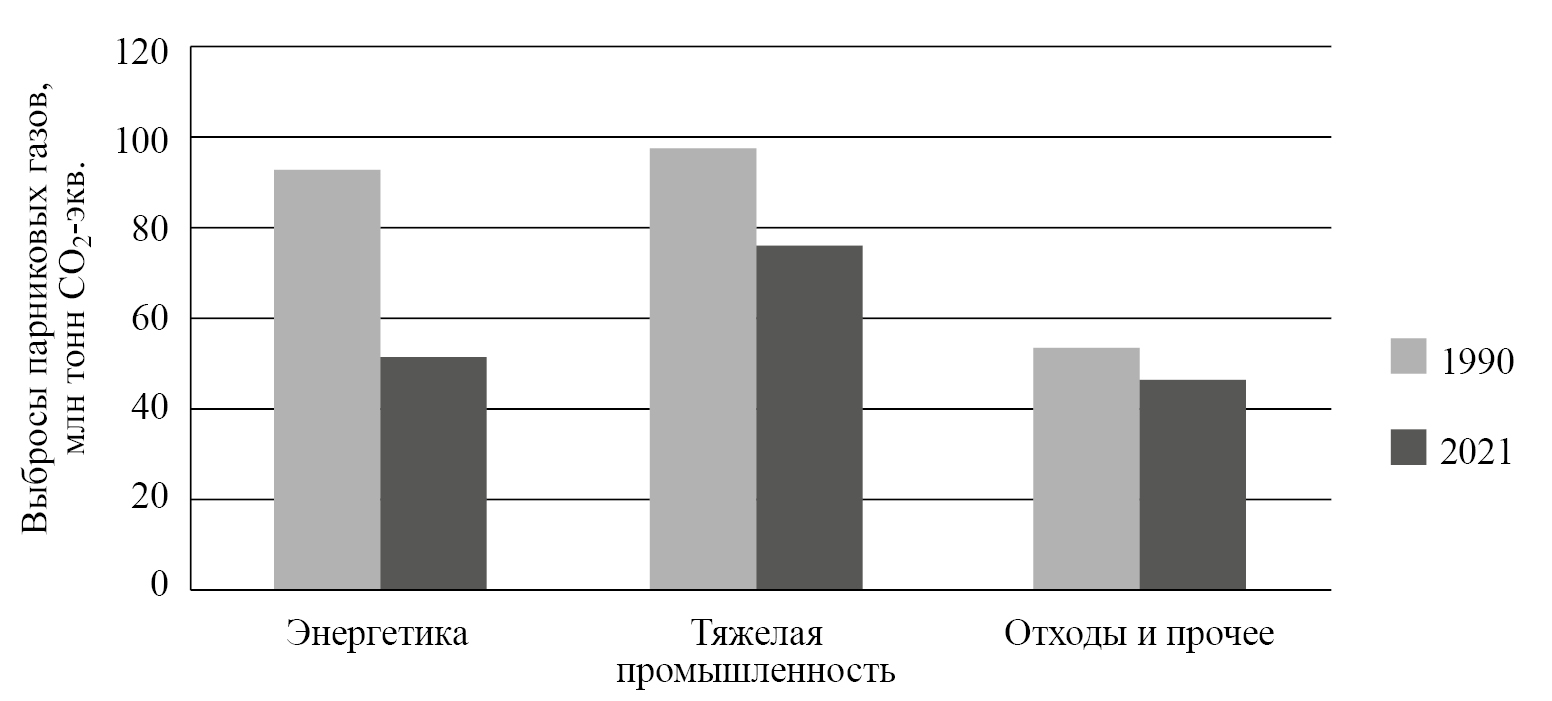 C 1990 по 2021 гг. в ряде отраслей возрастали выбросы парниковых газов: в нефтегазовой (на 88%), сельскохозяйственной (на 39%), транспортной (на 27%) и строительной (на 21%) (рис. 2).