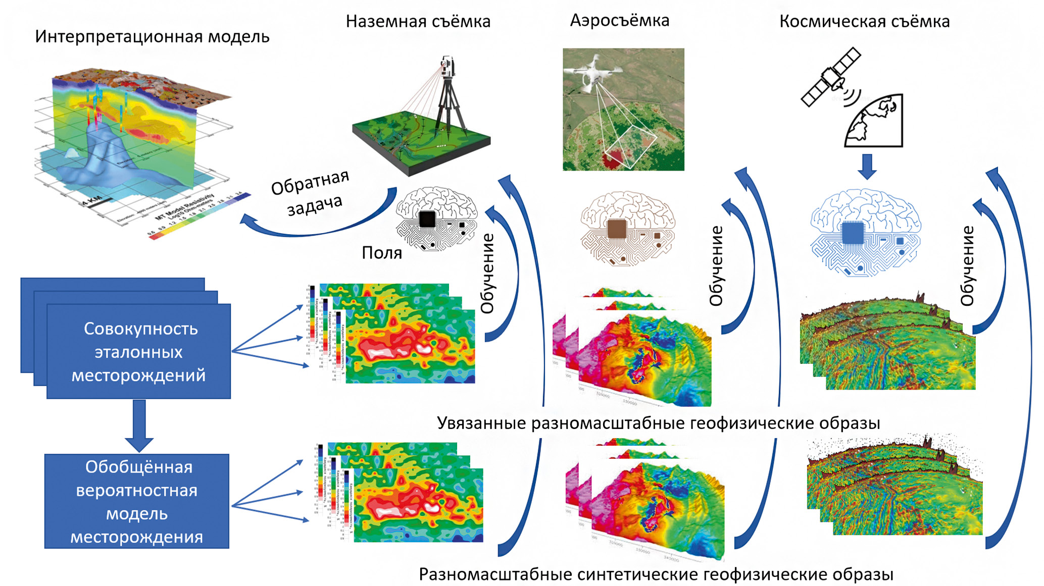 Рис. 1. Принципиальная схема поиска и разведки месторождений стратегического минерального сырья на основе разномасштабных геофизических исследований и методов распознавания образов