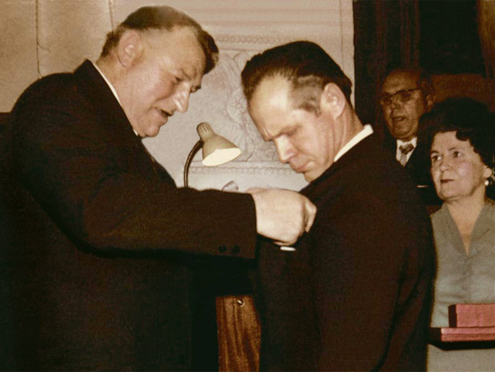 Министр общего машиностроения СССР С.А. Афанасьев вручает М.Ф. Решетнёву звезду Героя Социалистического Труда. 1974 г.