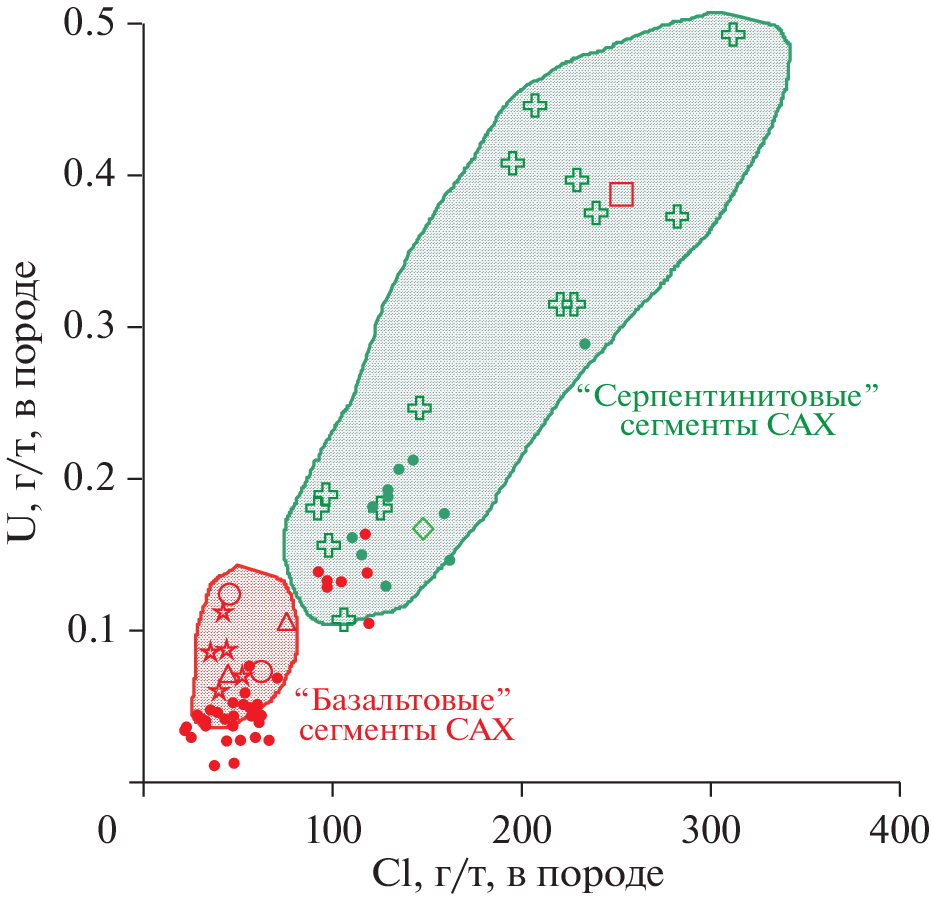 The geochemical peculiarities of sample collection of MORB chilled glasses obtained in six areas of the axial zone of the Mid-Atlantic Ridge (MAR), 12°–31° N have been studied. The results of this study provided information on the composition of the parent melts for these glasses and made it possible to assess probable geochemical effects reflecting the interaction of magmatic melts with hydrothermal systems of the MAR axial zone or with altered oceanic crust (AOC). It is shown that basalts of the E-MORB family which includes most of samples are localized mainly in the “cold” segments of the MAR in the crustal section of which serpentinites predominate. On the other hand, samples with depleted signature (N-MORB) belong to segments of the MAR in which serpentinite outcrops are either absent or play a subordinate role. The E-MORB chilled glasses from “cold” segments of the MAR show signs of contamination of basaltic melts with components borrowed either from the host serpentinites or from aqueous-saline fluids circulating in hydrothermal systems located in serpentinites (“serpentinite hosted”). Judging by the data obtained on the nature of variations in the content of Cl, U, and Sr in the studied chilled glasses belonging to the N-MORB family, there are no signs of intracrustal contamination. It is assumed that relics of the ancient continental lithosphere preserved under axial zone of the MAR and involved in the process of partial melting of the shallow mantle took part in the formation of E-MORB parental melts in some segments of the MAR.