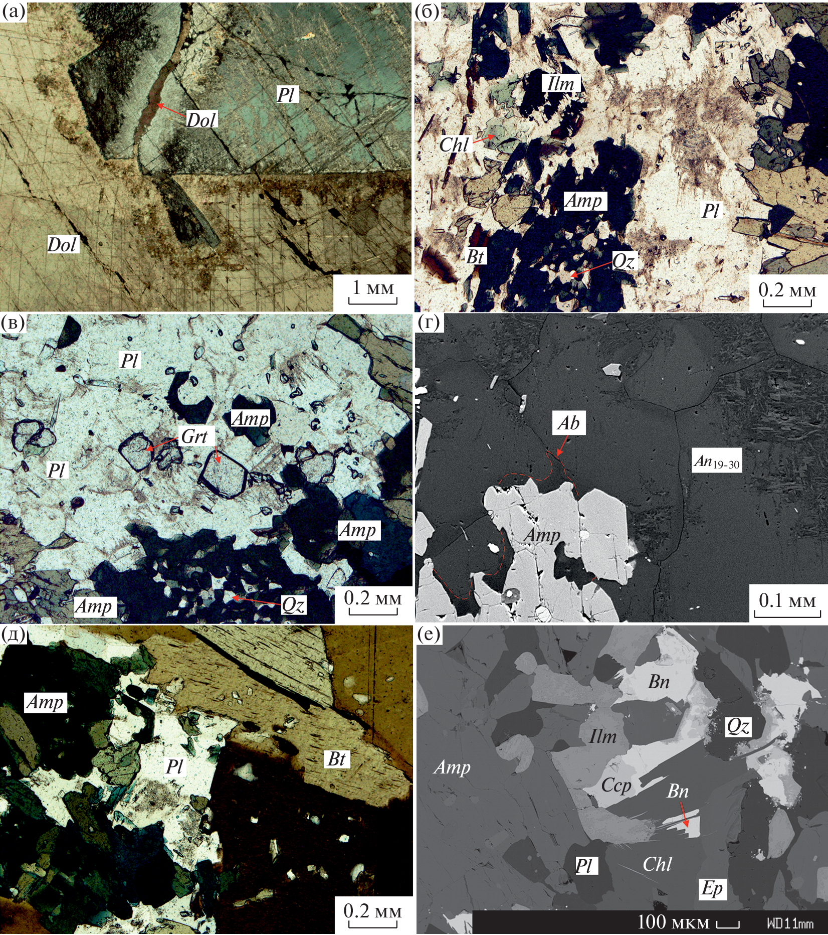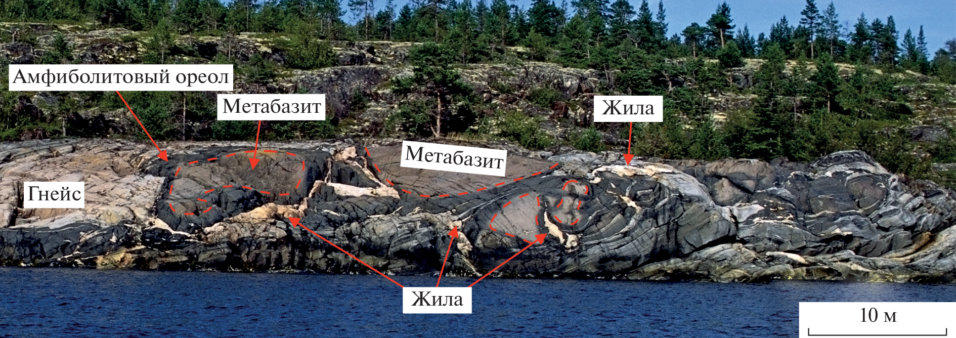 On the islands and the coast of the White Sea in North Karelia, the bodies of Early Proterozoic metamorphosed gabbroids are widely distributed in Archean gneiss. Carbonate-silicate veins with sulfide mineralization are confined to these bodies of metabasites, as well as to their contacts with gneiss. The main vein minerals are plagioclase, quartz, carbonates and chlorite. The stages of vein formation correspond to the transition from early quartz-plagioclase to late quartz-carbonate associations with chlorite and sulfides. The early (high-temperature) stage is fixed by the amphibolite aureoles around the vein with temperature estimates of about 550–650°C by the TWQ method. This stage corresponds to the quartz-plagioclase association of the marginal zones of the veins. The transition to the late stage with the formation of veined quartz-carbonate associations (± biotite) occurred at temperatures of 540°C and lower, judging by the calcite-dolomite associations. Further development of quartz–chlorite–carbonate and sulfide associations in veins and wall amphibolites corresponds to a decrease in temperature to 350°C and below, judging by chlorite thermometers. Vein formation and near-vein amphibolitization are presumably associated with the impact of metamorphic fluids at the latest retrograde stage of metamorphism in the Early Proterozoic.