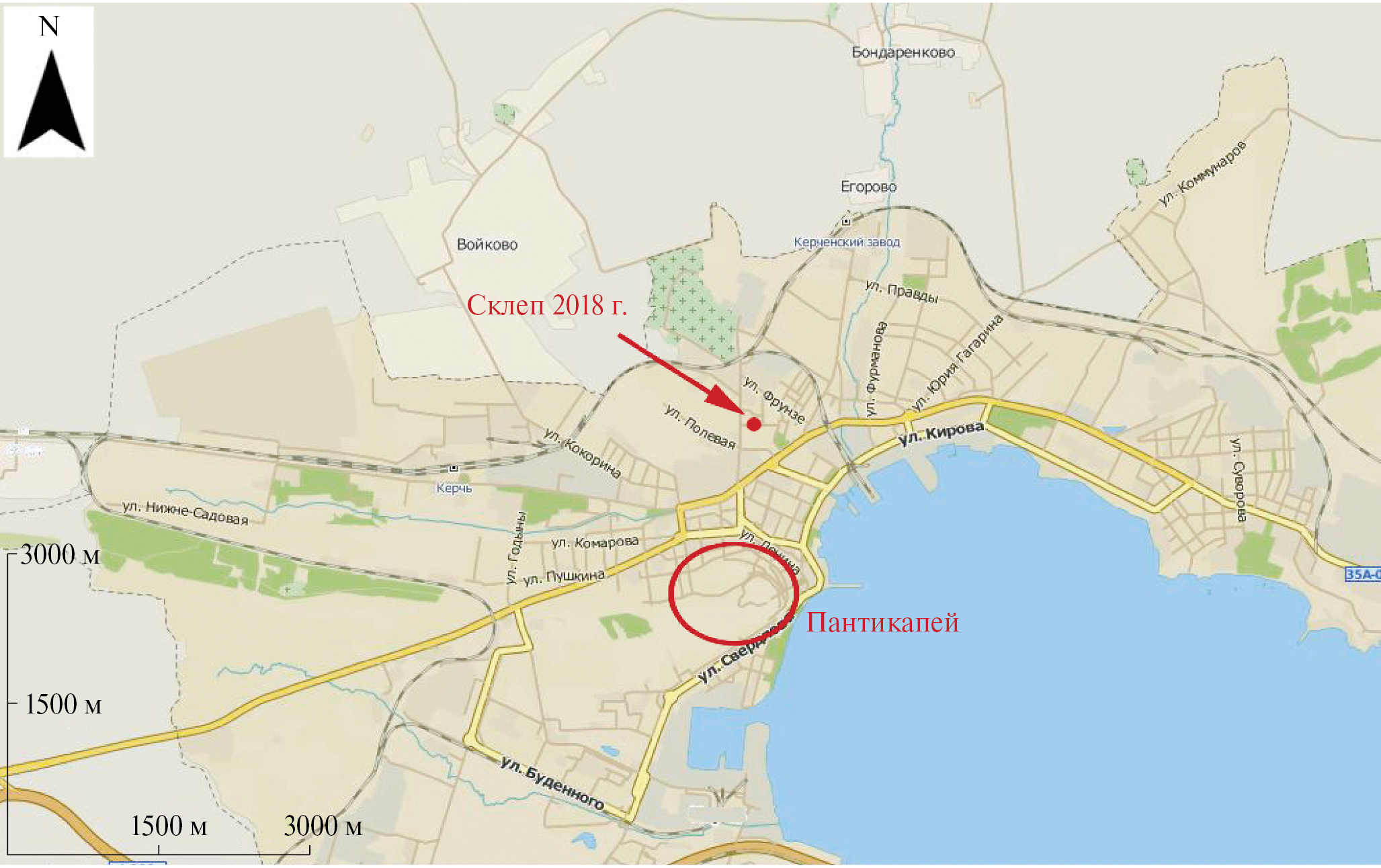 Рис. 1. Спутниковый снимок центральной части г. Керчь с указанием местоположения склепа 2018 г.