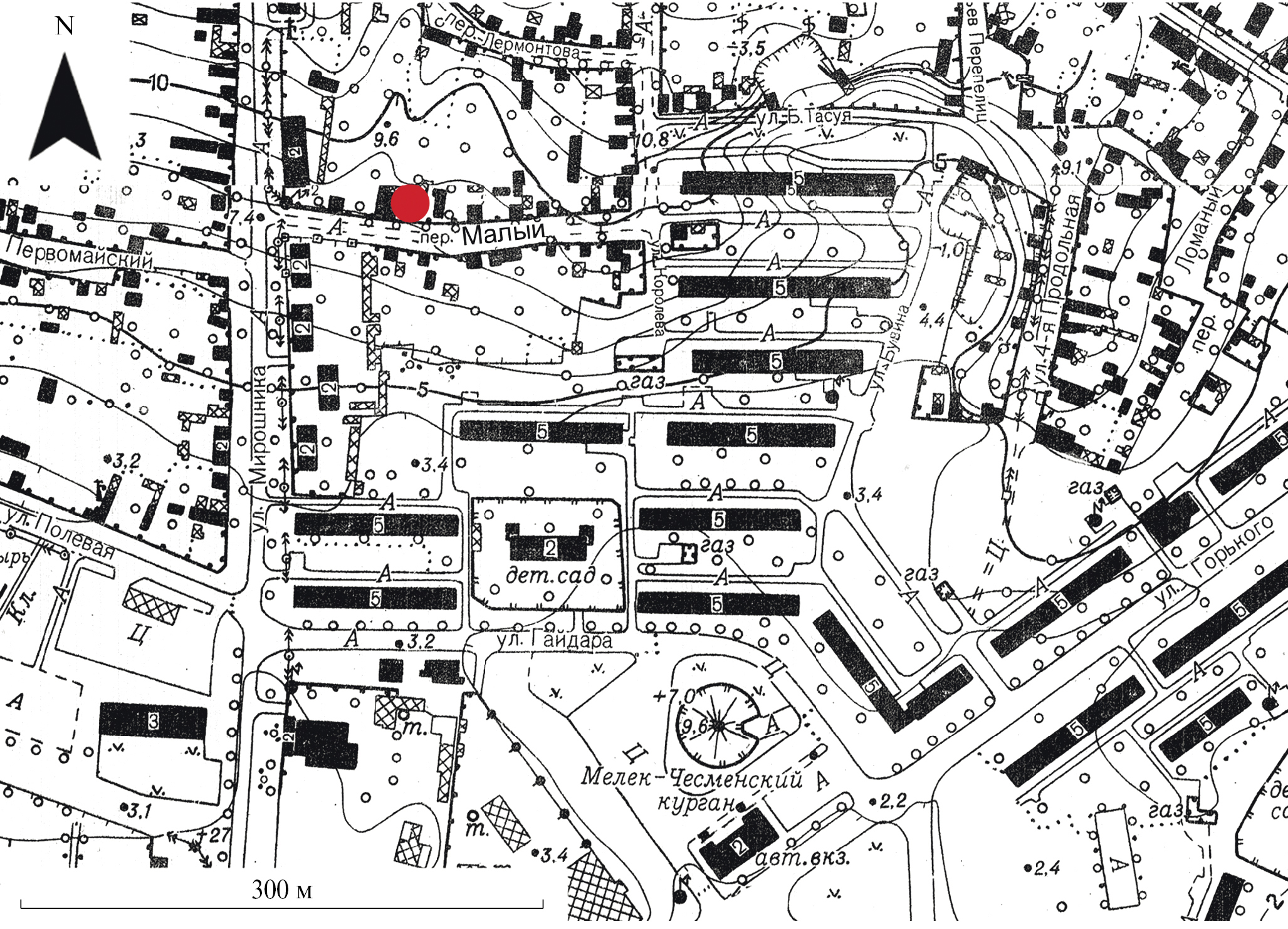 Исследование склепа в переулке Малый1. Расположенный к северу от Пантикапея один из участков курганно-грунтового некрополя – “Глинище” – стал известен еще в XIX в. благодаря обнаружению таких уникальных погребальных комплексов, как склепы Деметры и Мелек-Чесменского кургана, погребение “с золотой маской”. Этот участок стал формироваться еще в эпоху ранних Спартокидов. В первых веках нашей эры некрополь достиг своих максимальных размеров. Наиболее поздняя группа погребений, локализующаяся к северу от р. Мелек-Чесме, датируется IV–V вв. н.э. (Шестаков, 2004. С. 428, 429). Вероятно, одним из элитных участков некрополя являлась территория между современными улицами Мирошника и Братьев Перепелиц (рис. 1, 2).