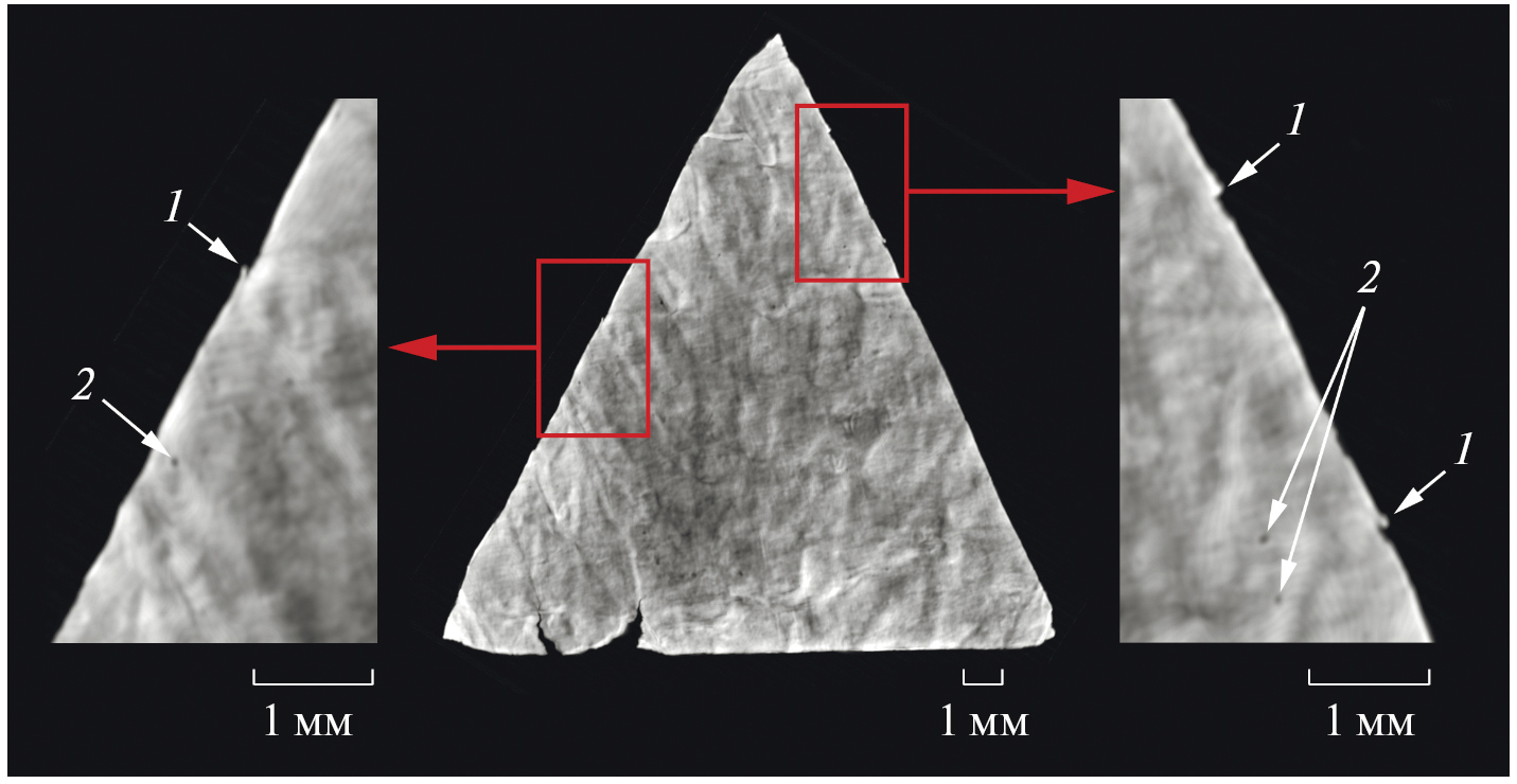 Рис. 6. Результаты рентгеновской томографии треугольной аппликации: 1 – следы режущего орудия на краю аппликации, 2 – сквозные отверстия.