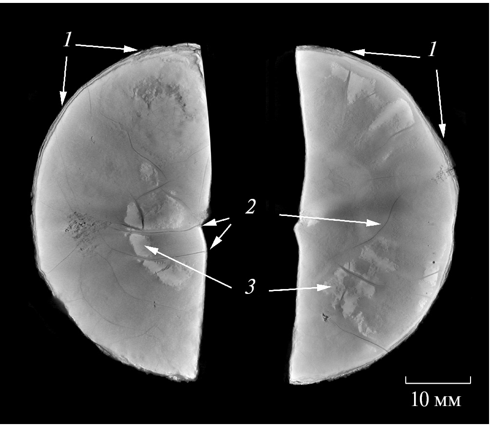 Рис. 7. Рентгенотомографические сечения фрагментов зеркала: 1 – приповерхностные слои коррозии; 2 – трещины; 3 – предположительно, области наилучшей сохранности металла.