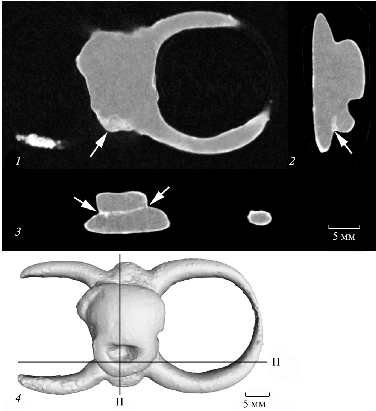 Рис. 8. Нейтронотомографические сечения пряжки в трех взаимно перпендикулярных плоскостях (1–3) с областями коррозии (отмечены стрелками), лежащими под центральным декоративным элементом. Положение секущих плоскостей I и II для сечений 2 и 3 соответственно указано на объемной модели (4).
