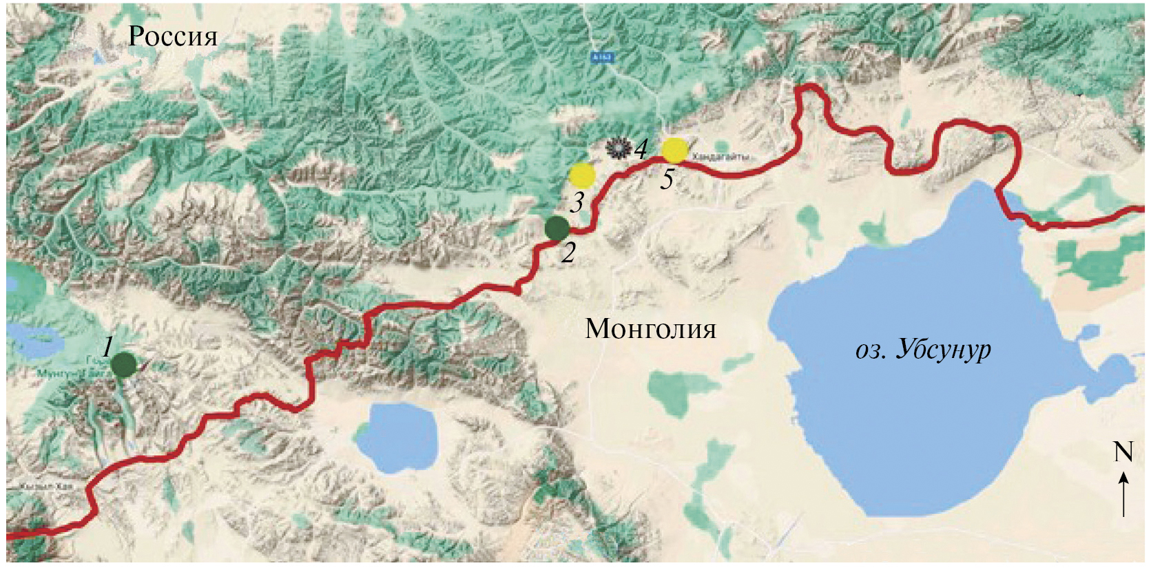Рис. 1. Карта-схема района отбора образцов, в результате исследования которых построены древесно-кольцевые хронологии. 1, 2 – верхняя граница леса, хронологии Mongun и Kolch (соответственно); 3, 5 – лесостепная зона, хронологии Bora и Han (соответственно); 4 – стоянка Кара-Дыт II, хронология KD.