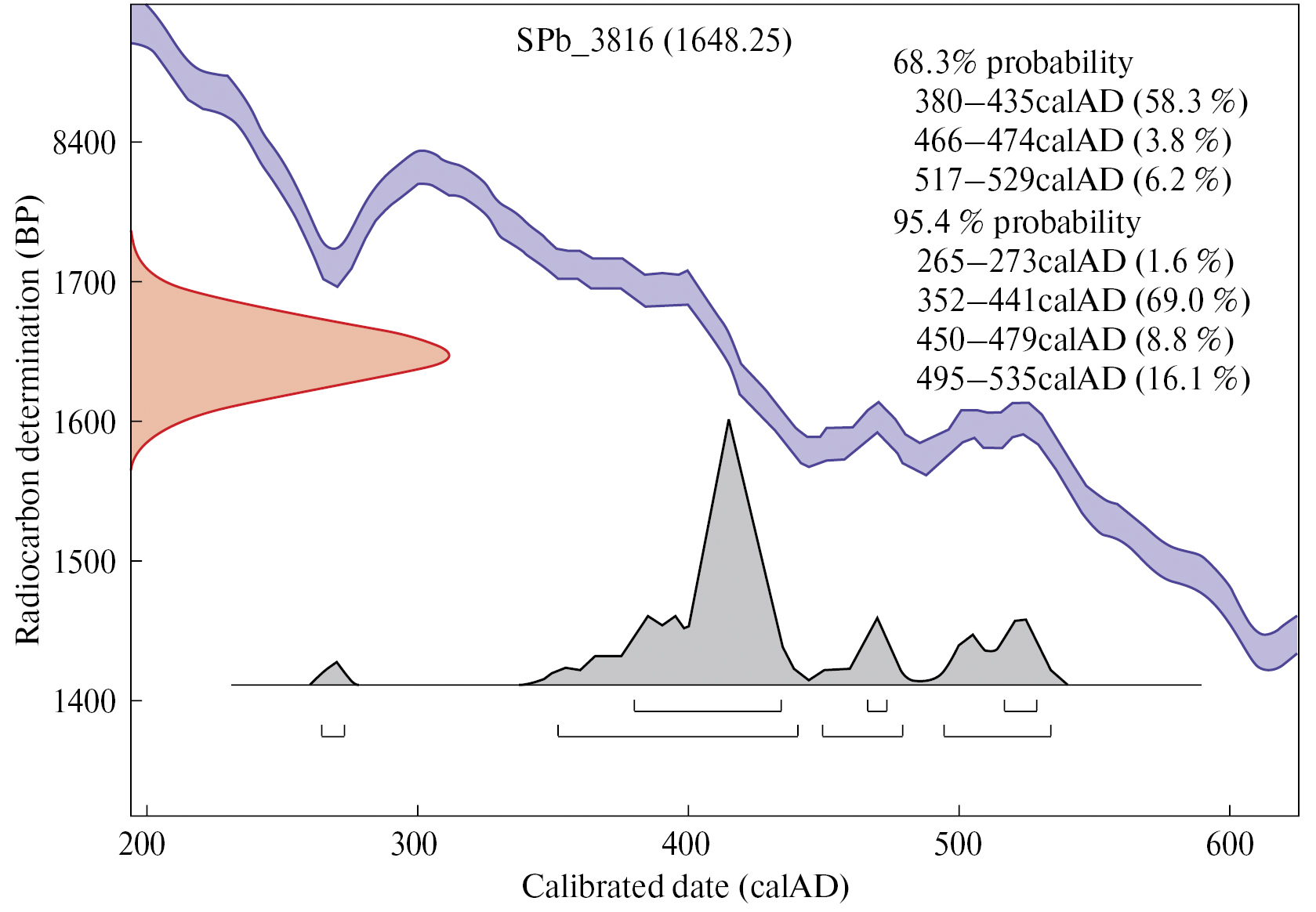 Последующая калибровка радиоуглеродной даты проводилась при помощи программы OxCal 4.4. Из рис. 5 хорошо видно, что с наибольшей вероятностью время заготовки древесного угля приходится на интервал с 352 по 441 г. н.э.