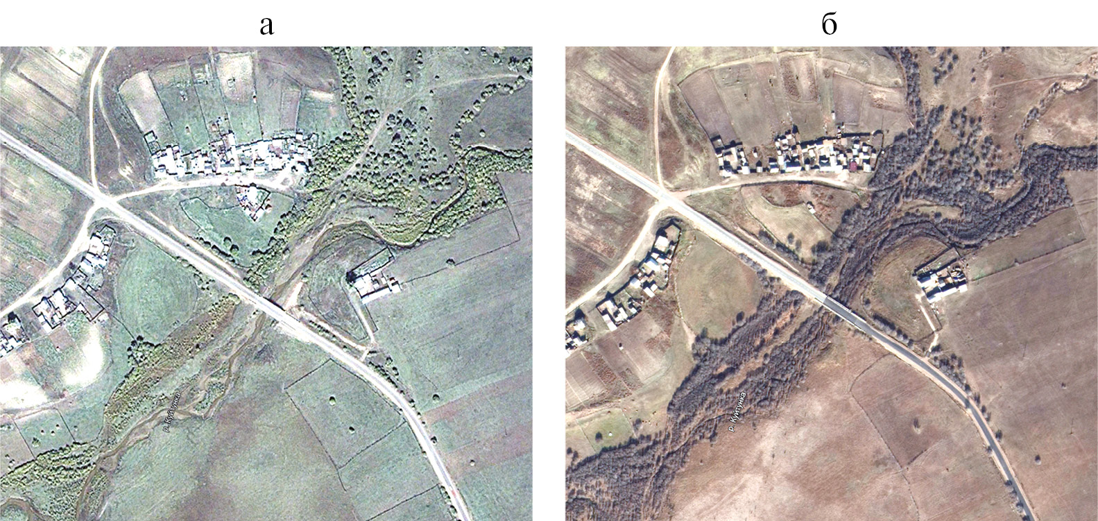 Другим фактором, определяющим перераспределение стока грунтовых вод и увеличение количества наледей, являются процессы зарастания прирусловых участков пойм ивняками. За длительный маловодный период, который продолжался с начала 2000-х годов [17] и продолжался до 2018 г., в Селенгинском среднегорье произошла смена системы хозяйствования. По экономическим причинам и в связи с отсутствием гидрологических угроз не проводились мероприятия по расчистке русел водотоков и прилегающих территорий от зарослей ивы, сократилось поголовье скота, который выступал естественным лимитирующим фактором обильного разрастания кустарников. Результатом стало зарастание пойм. На снимке Google Earth (рис. 5а) 2004 г. хорошо просматривается русло р. Куйтунка, в 2024 г. (рис. 5б) оно неразличимо среди зарослей кустарника. Такое наблюдается в долинах малых рек практические повсеместно.