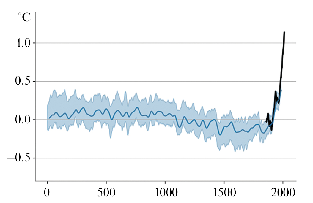 Рис. 1. Картина изменения средней температуры Земли за последние две тысячи лет. Синяя кривая – восстановленный по различным данным график температуры, синяя область – доверительный интервал, черным показана температура в инструментальный период [2], модифицировано.