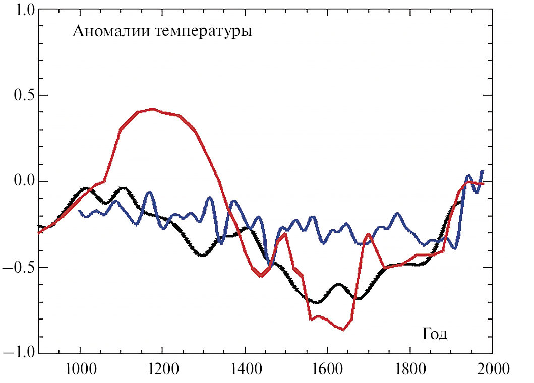 На рис. 2 показаны графики реконструированной средней температуры Земли за последнюю тысячу лет: красным цветом показана глобальная температура из отчета МГЭИК 1990 г. [5] на основе температур центральной Англии [8], синим цветом показана глобальная температура из отчета МГЭИК 2001 г. [6] на основе работы [9], черным цветом показана глобальная температура из работы [7]. Хорошо видна существенная разница температурных кривых, опубликованных в отчетах МГЭИК за 1990 г. (красная кривая) и за 2001 г. (синяя кривая), а именно: в более позднем отчете исчезло значительное потепление, отвечающее уже упомянутому средневековому оптимуму. В дальнейшем выяснилось, что такая «модернизация» температурной кривой была сделана специально, чтобы убедить мировую общественность в абсолютной уникальности современного потепления климата и получить таким образом якобы неопровержимые доказательства справедливости утверждения об антропогенной природе глобального потепления. Отмеченная фальсификация данных, произведенная американским климатологом М. Манном и некоторыми его коллегами, получившая название «Климатгейт», была устранена в более позднем докладе МГЭИК 2013 г., где признается реальность теплой средневековой климатической аномалии (Medieval Climate Anomaly) в период с 950 по 1250 г. [10]. Однако доверие к аргументам активных сторонников антропогенной концепции потепления этим эпизодом было серьезно подорвано.